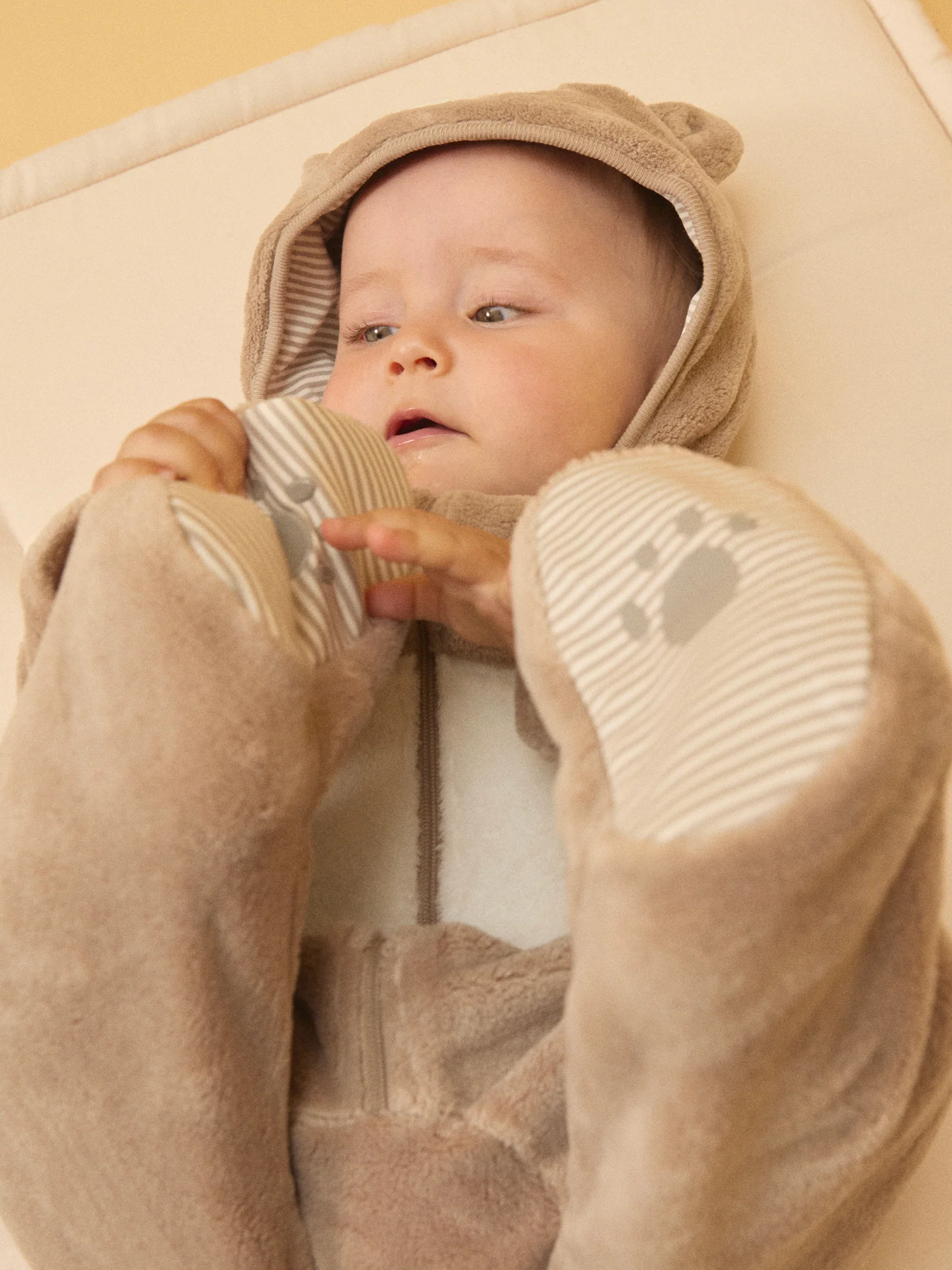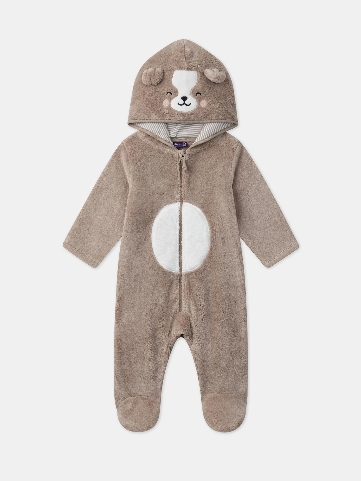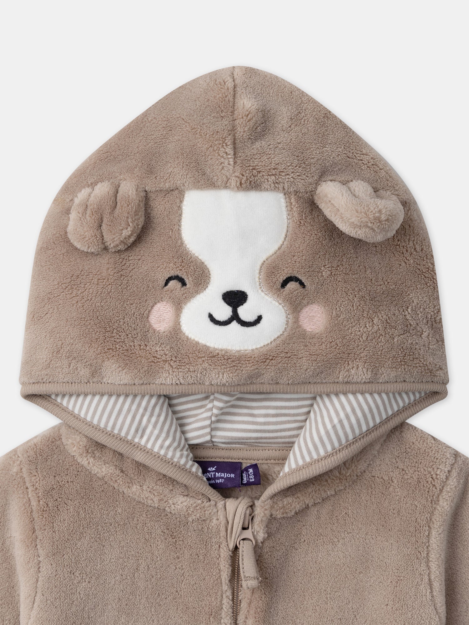 - Capuche fantaisie avec tête de petit chien avec empiècements en velours écru et détails brodés. Oreilles fantaisie en 3D. Doublure de la capuche en jersey à rayures dans les tons grège foncé sur fond écru