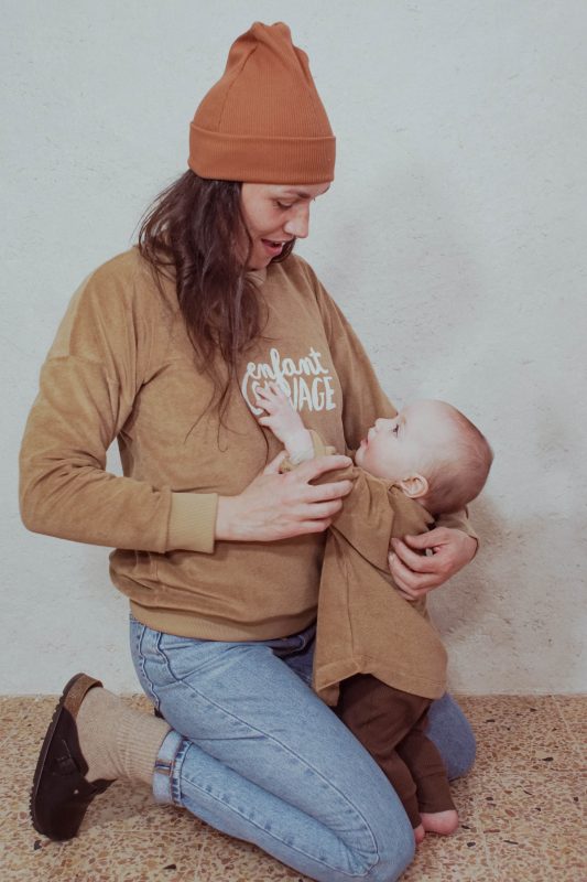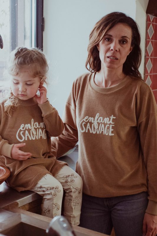 Un sweat loose hyper confortable, c’est notre basique revisité! On l’enfile rapidement, on s’y sent comme dans un coton et il égaiera n’importe quelle tenue: à porter avec un jean, une jupe MARGOT, un pantalon classique pour un look décalé. A assortir au sweat enfant pour vos looks matchy matchy. On adore ses mots doux “Enfant sauvage” qui donneront le sourire aux personnes que vous croiserez! Il réveillera l’enfant qui est en vous les matins où c’est un peu plus dur 😉 Le petit + : on aime sa coupe comfy et sa matière doudou (Violyne et Lucie portent une taille S. Elles…