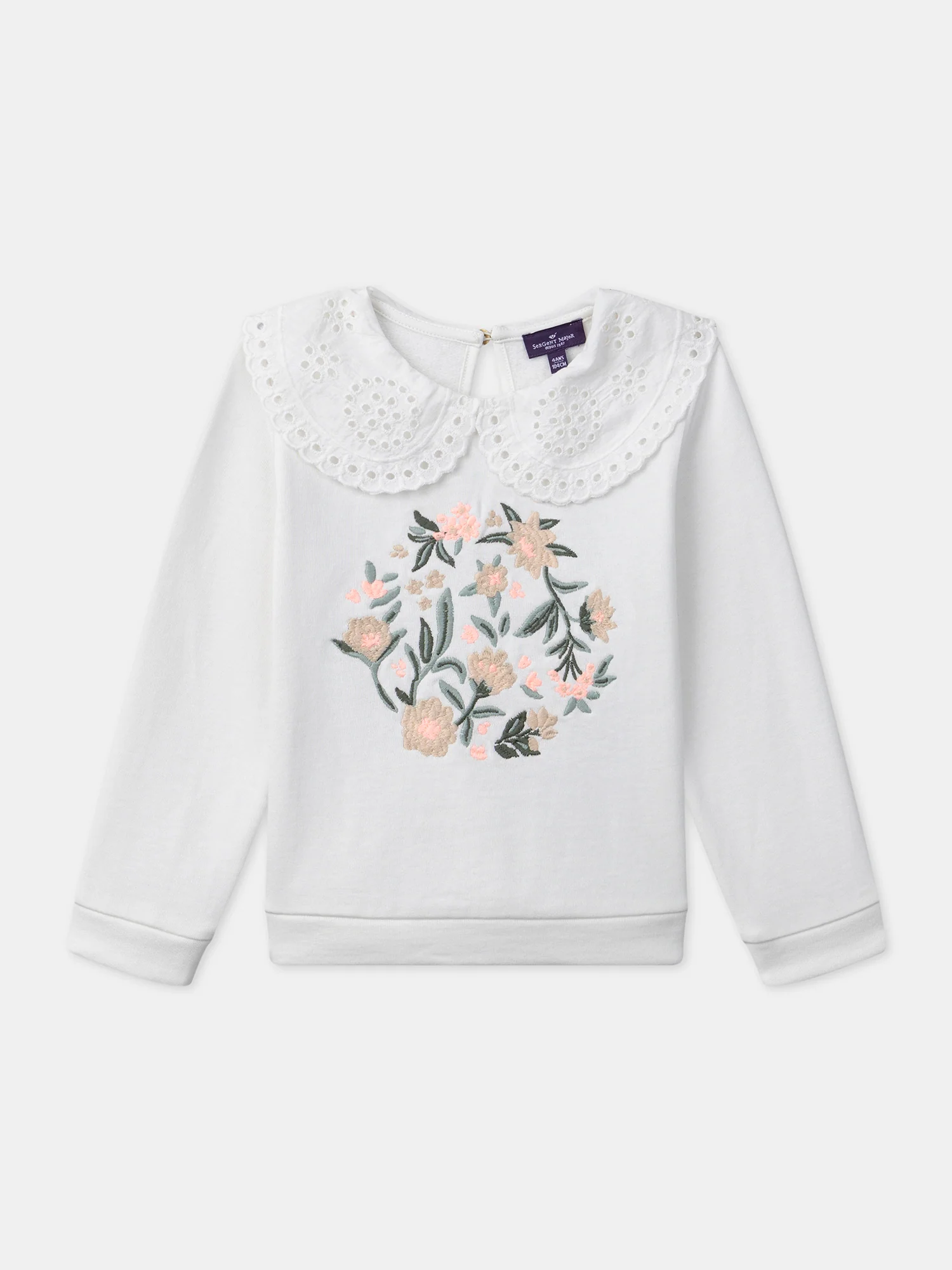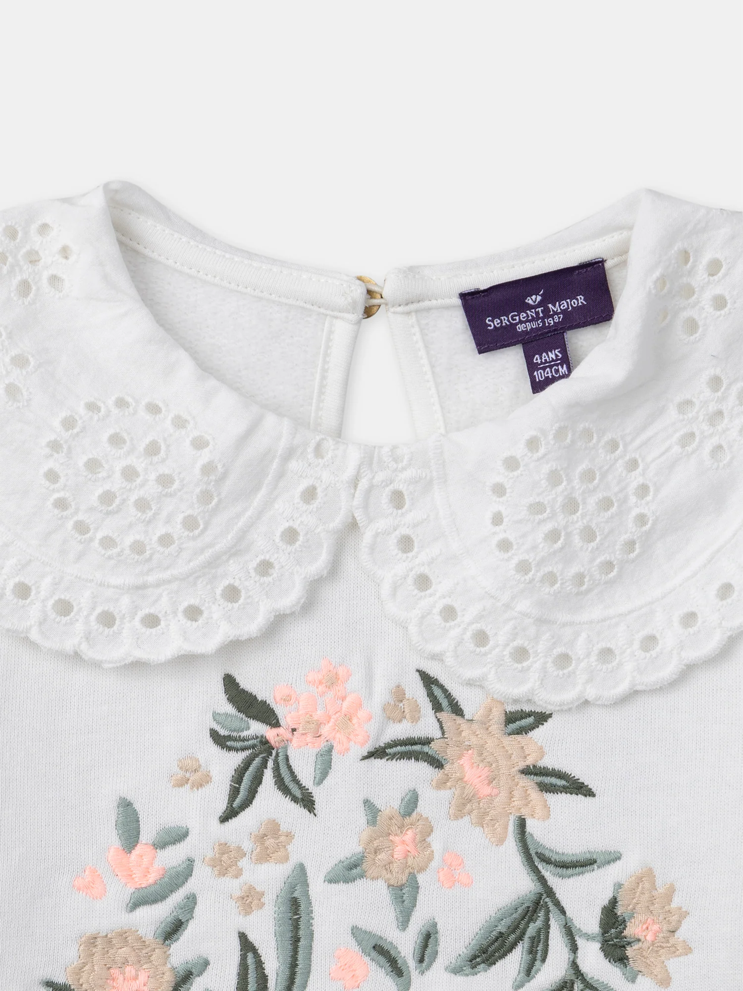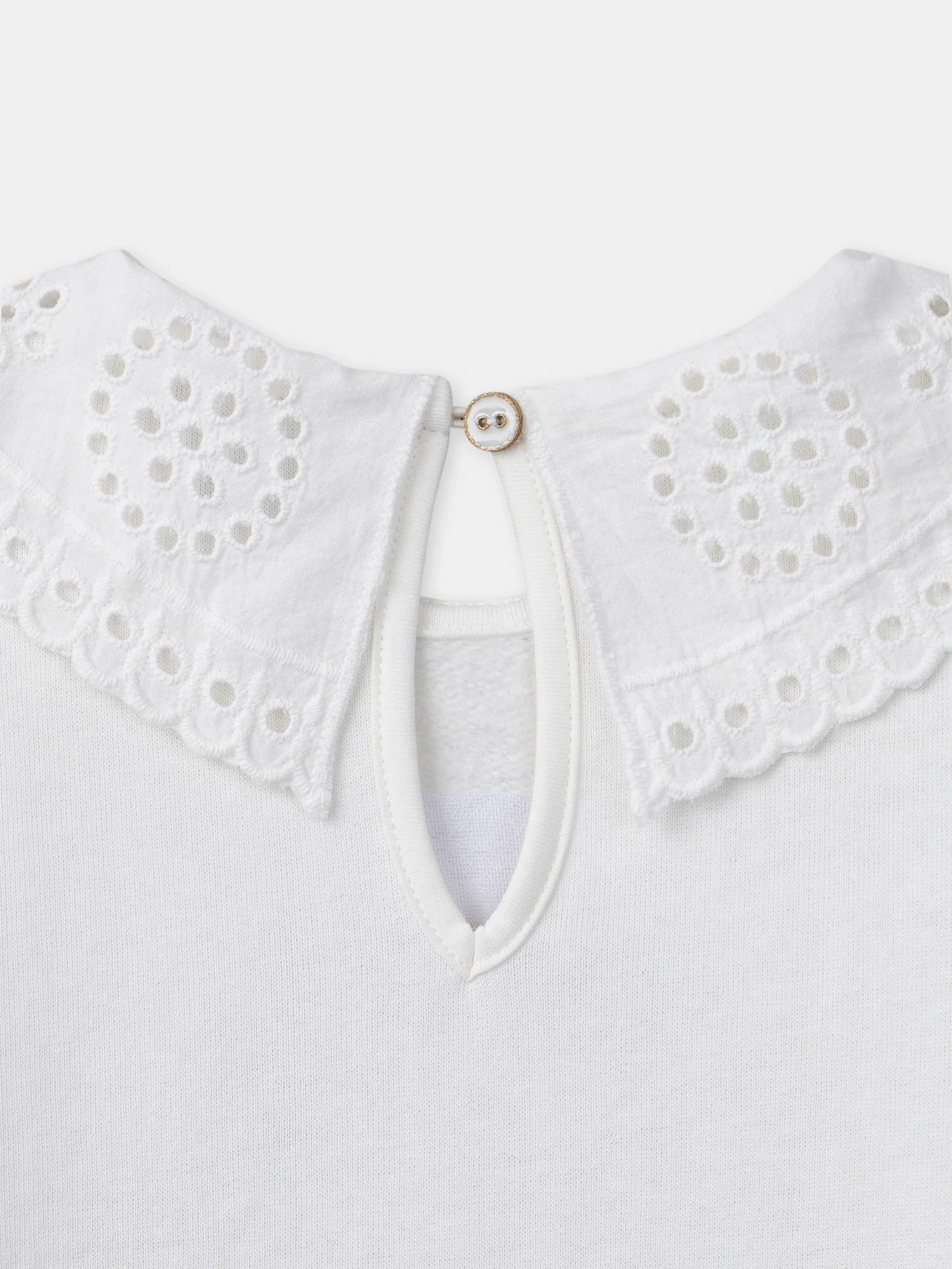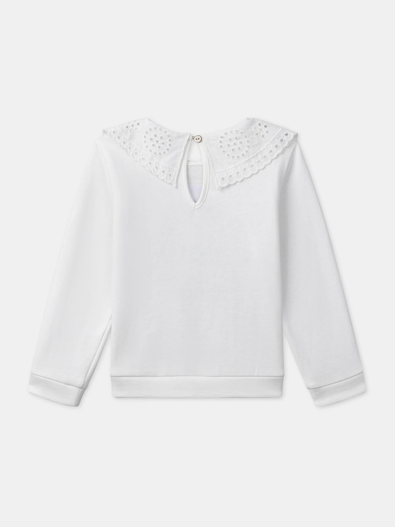 Pour les petites filles pleines de douceur, ce sweat col claudine est parfait pour les journées fraîches. Son col claudine orné de dentelle ajourée et ses fleurs brodées sur le devant apportent une touche délicate et raffinée. L’ouverture goutte dans le dos ajoute une finition élégante, tout en facilitant l’habillage.