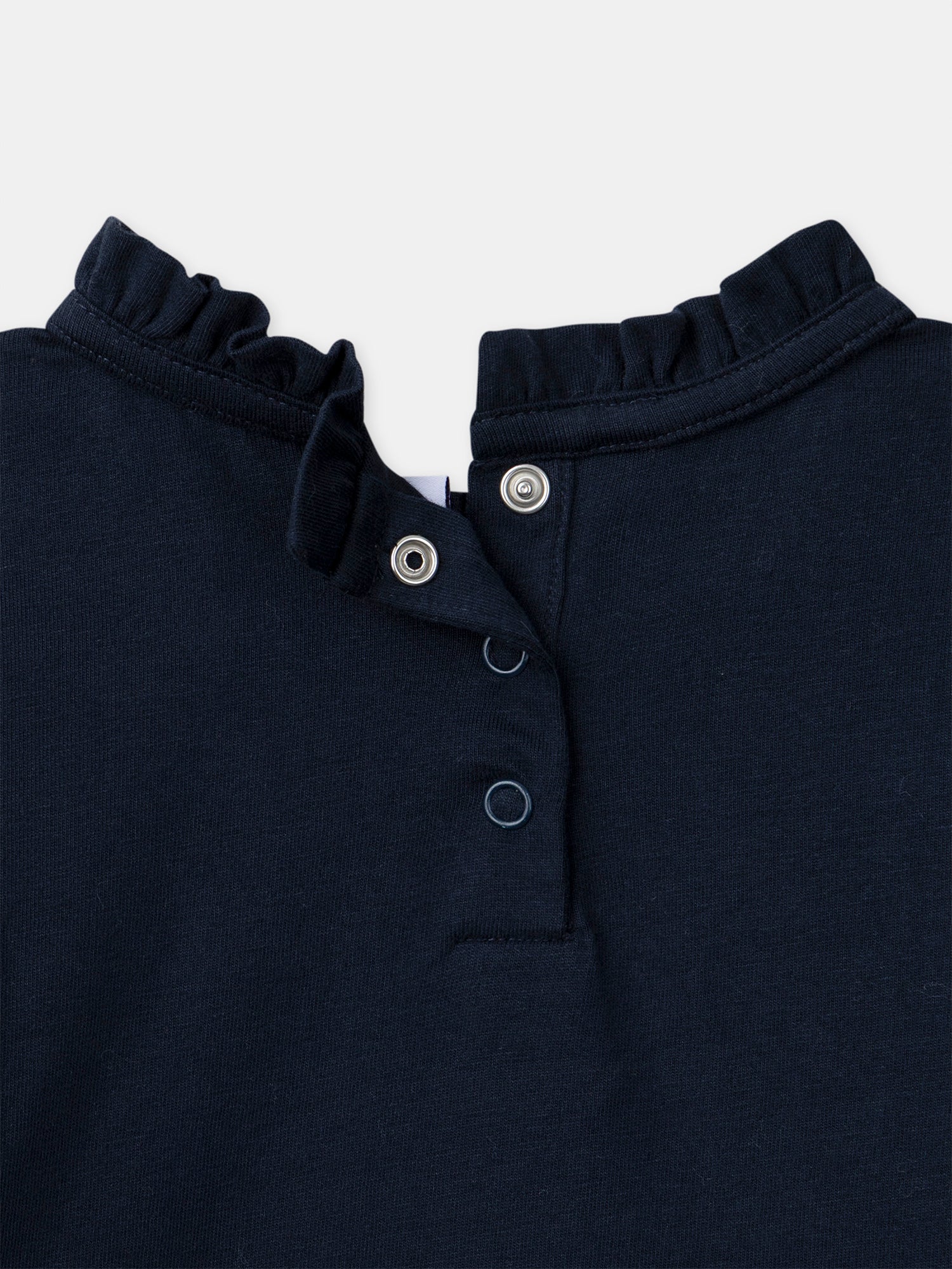 Idéal pour l’hiver, ce t-shirt accompagne les moments festifs des plus jeunes. Confectionné en jersey effet peau de pêche bleu nuit, il apporte douceur et confort. L’étoile dorée imprimée et les boutons pressions au dos signent son style de saison.