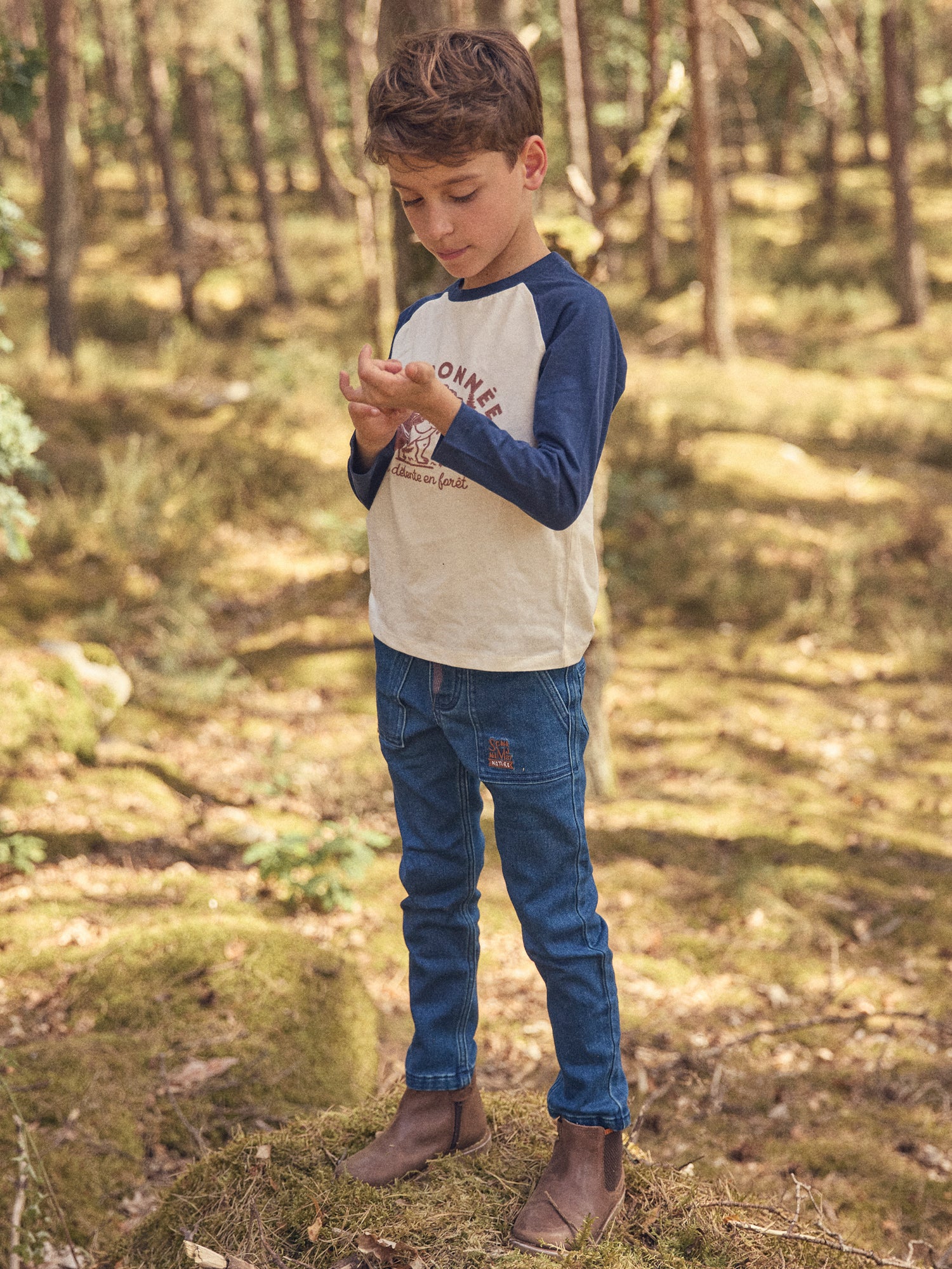 Idéal pour les enfants énergiques qui aiment bouger, ce t-shirt se glisse facilement sous un pull ou un gilet. Confectionné en jersey écru et bleu marine effet peau de pêche, il offre douceur et confort. Son imprimé en flock et ses manches raglan rappellent l’esprit randonnée.