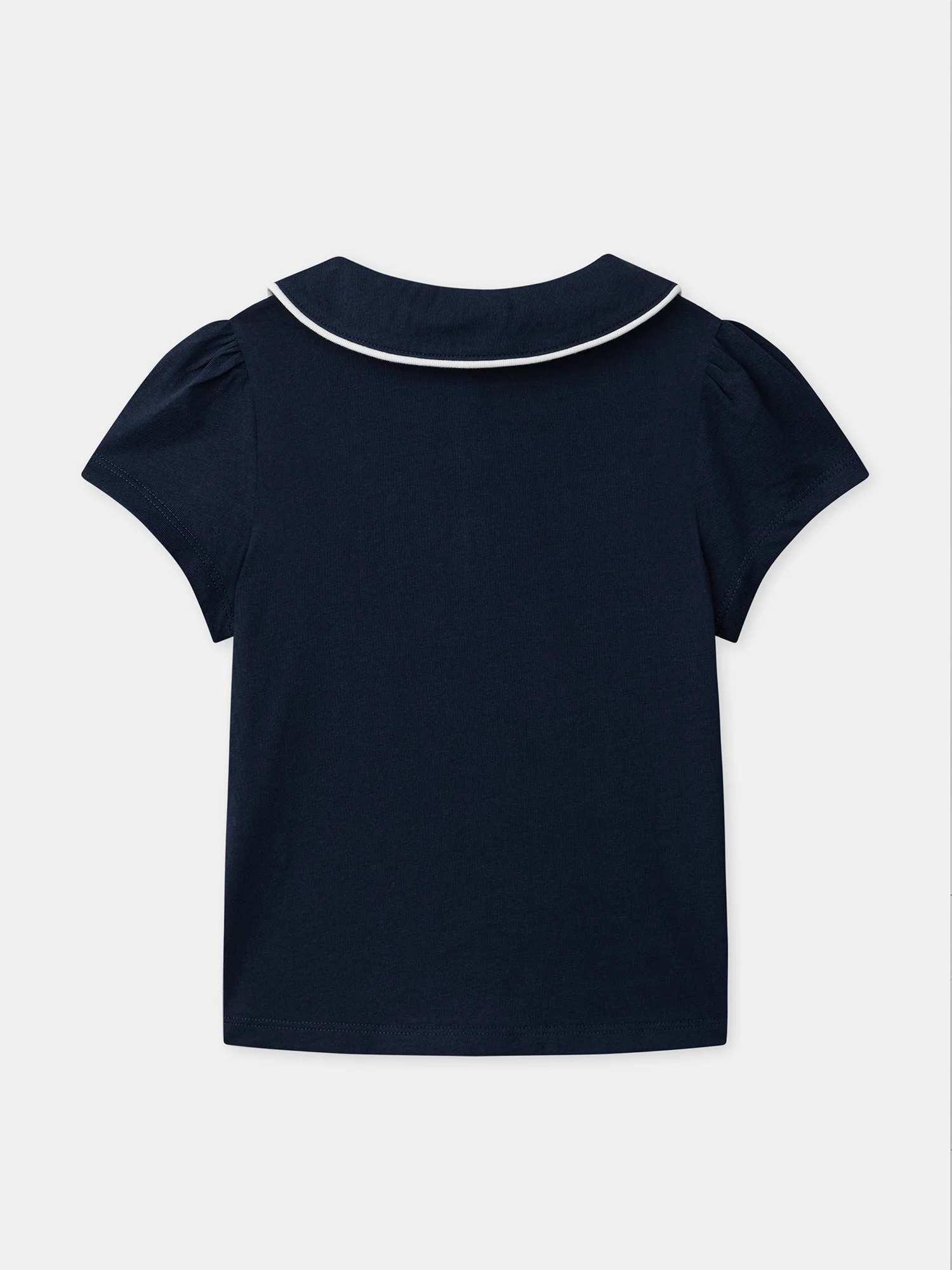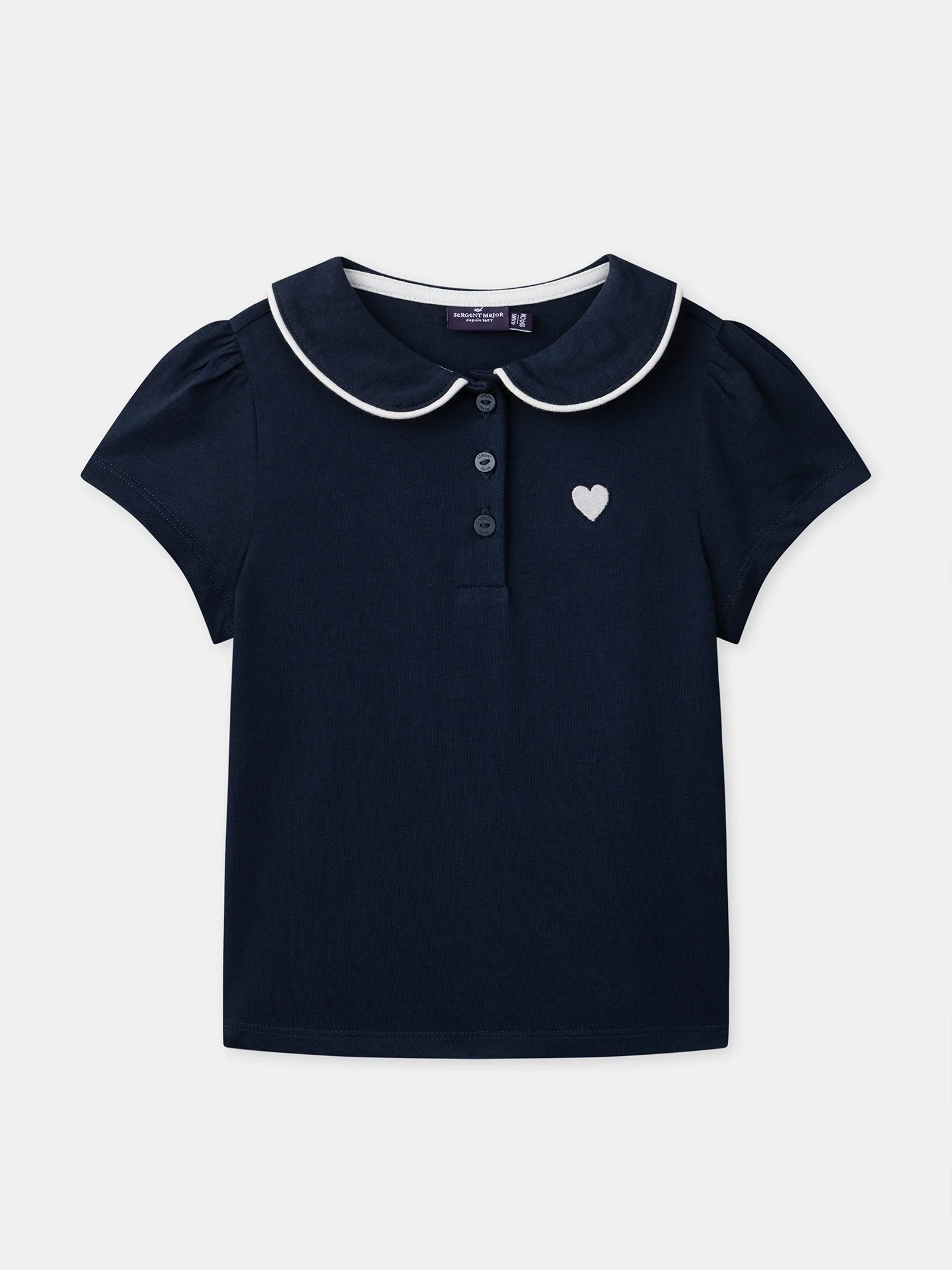 Parfait pour une enfant délicate qui aime les looks sobres au printemps. Le jersey marine offre confort et tenue. La broderie cœur et le col claudine contrasté apportent raffinement.