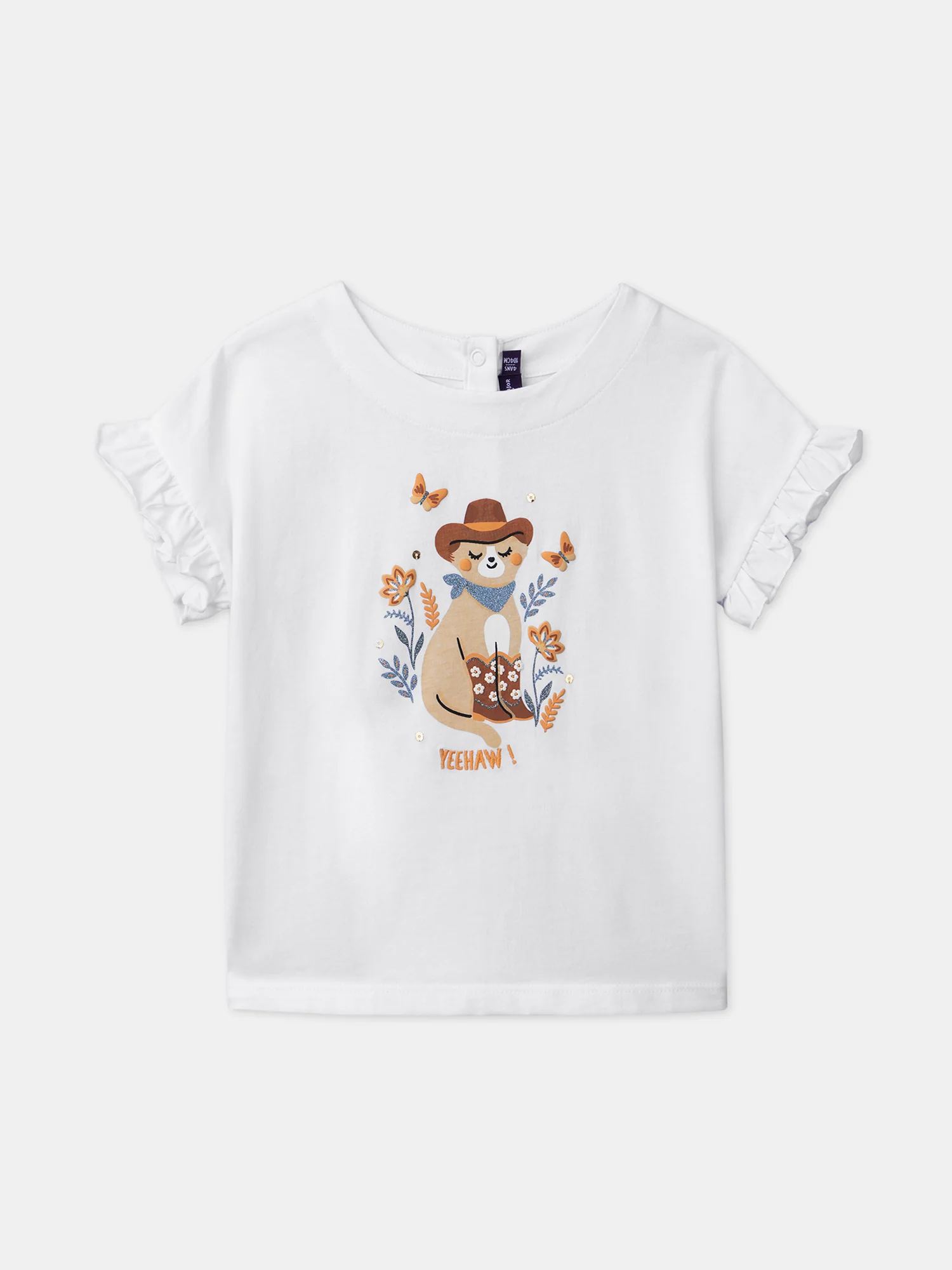 Ce t-shirt Chat cowboy est un choix fun et tendance pour votre enfant. Les volants au niveau des manches ajoutent une touche de légèreté, tandis que l’imprimé de chat cowboy avec des paillettes donne un look original et pétillant. L’ouverture par boutons dans le dos assure une mise en place facile et confortable.
