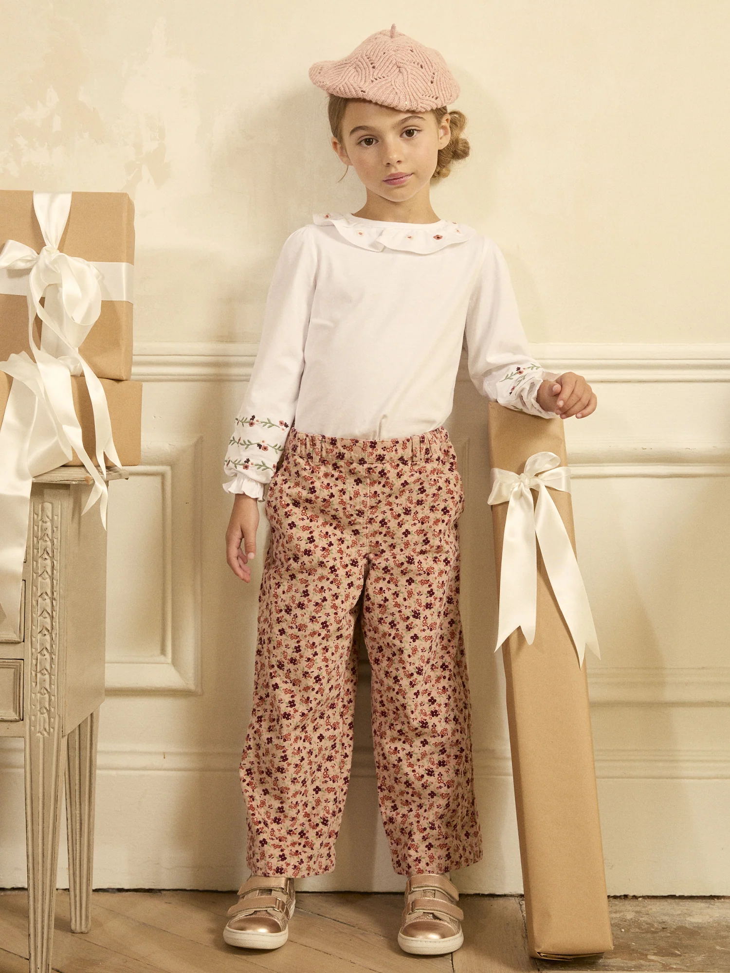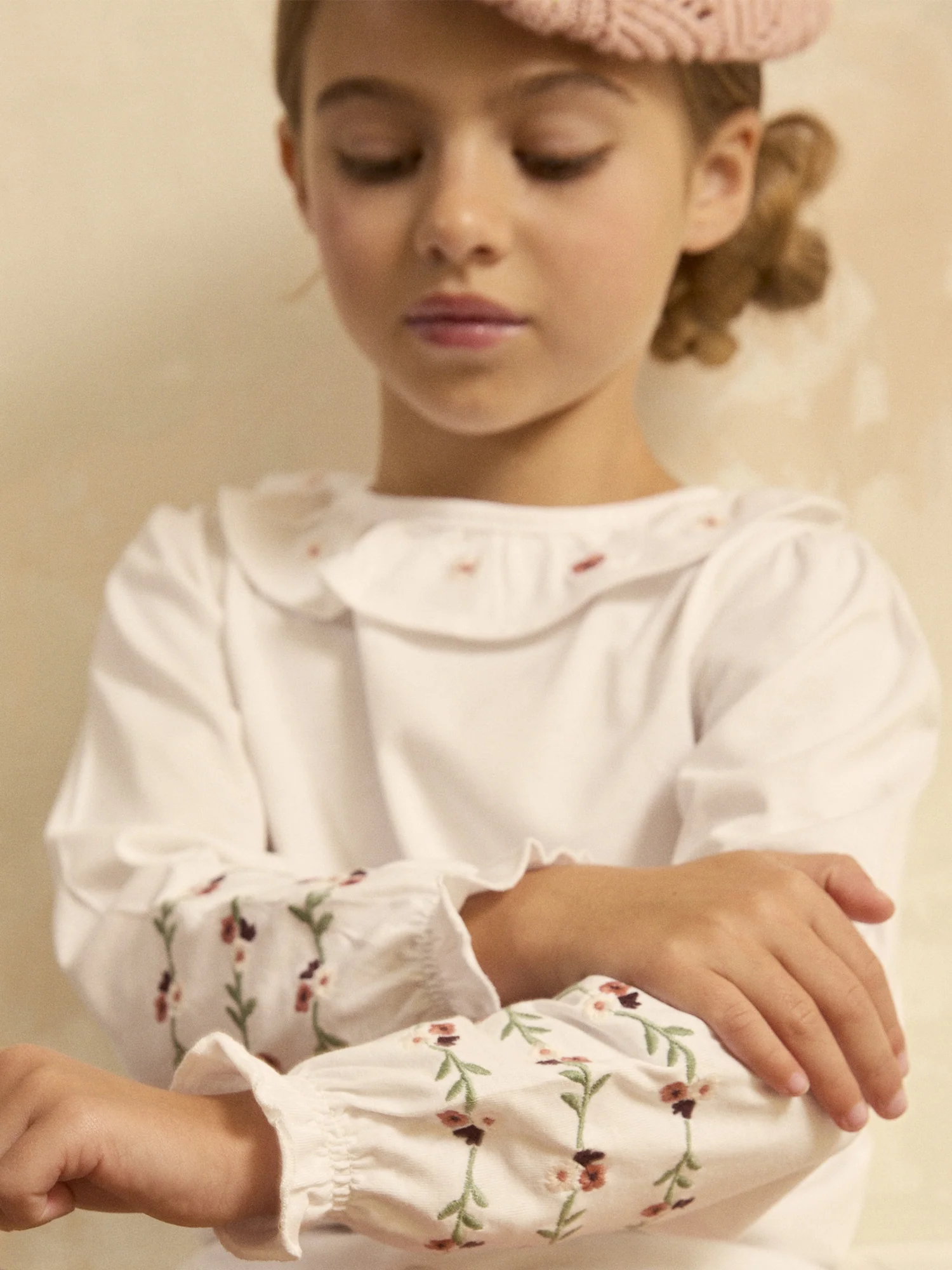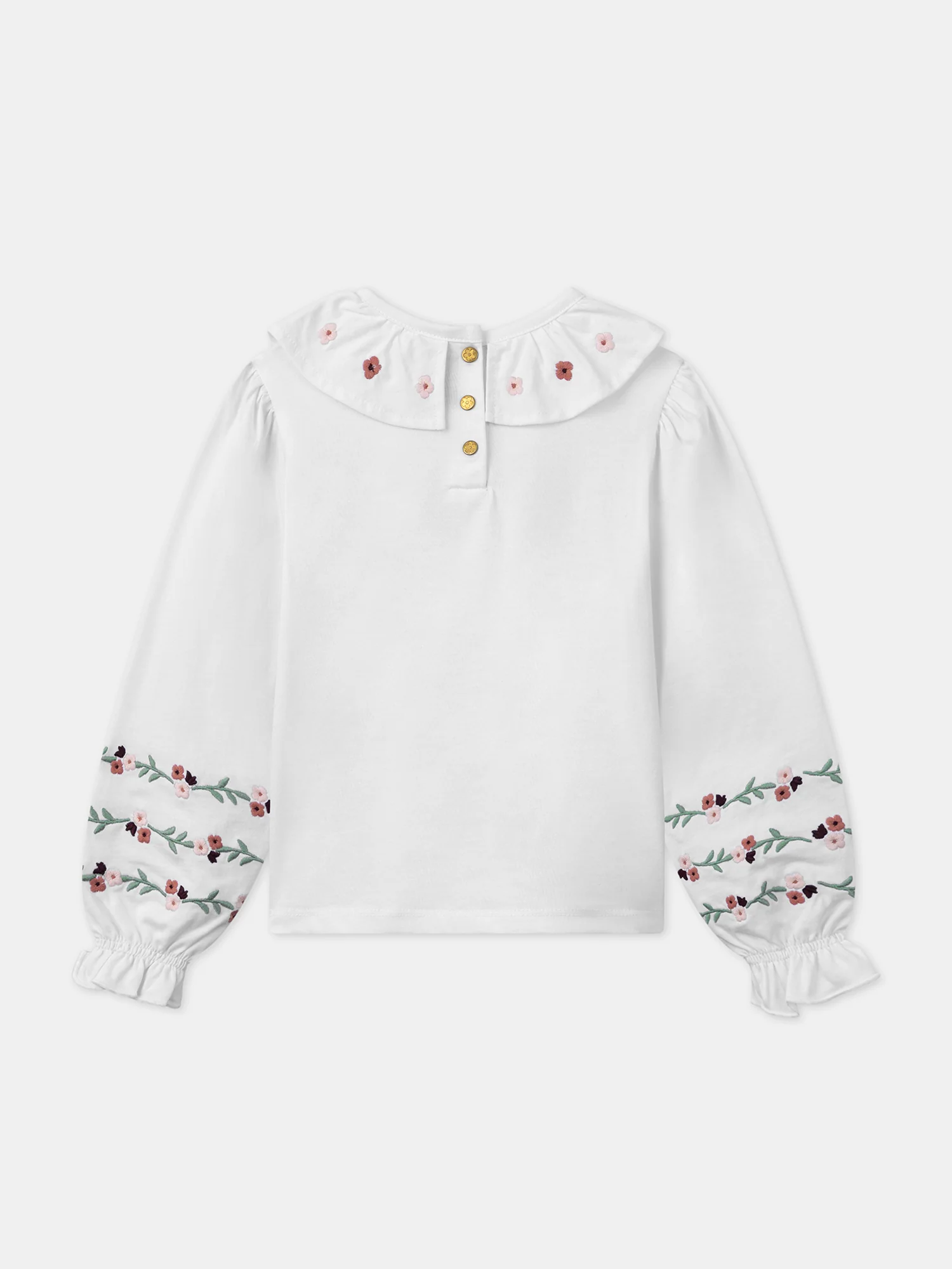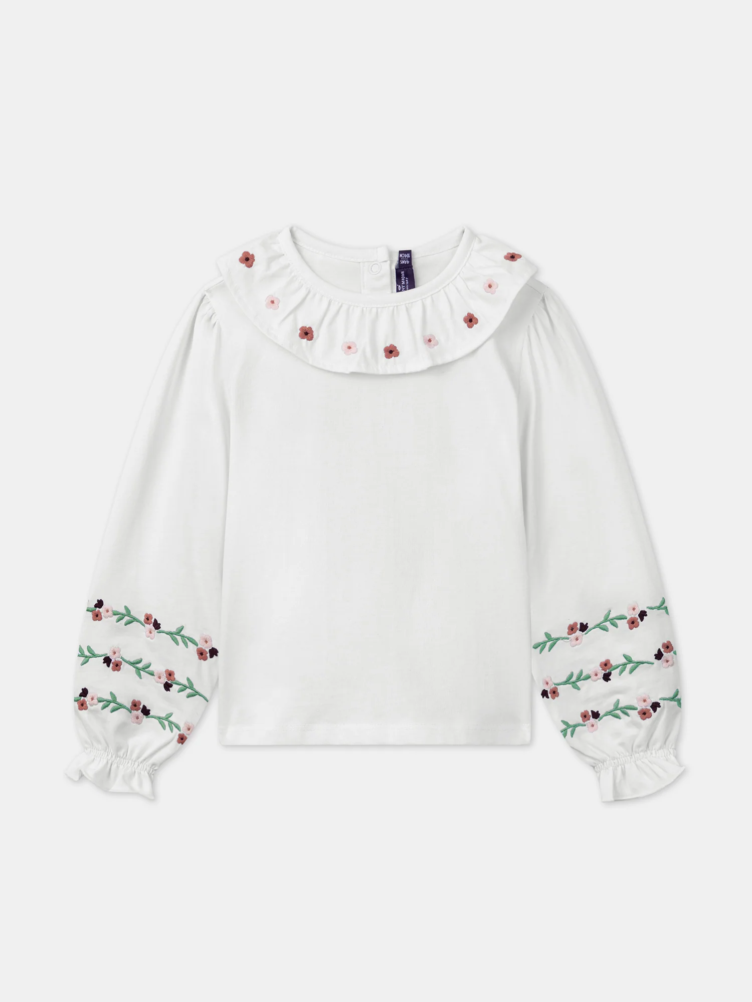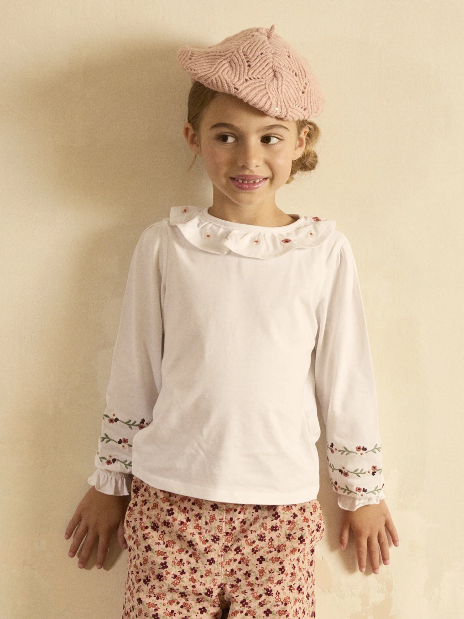 Ce t-shirt écru brodé est idéal pour apporter une touche de douceur et d’élégance au quotidien. Orné de broderies florales, avec un volant à l’encolure et des manches élastiquées, il allie délicatesse et confort. Son effet peau de pêche et les boutons-pressions au dos facilitent l’habillage tout en restant pratique et raffiné.