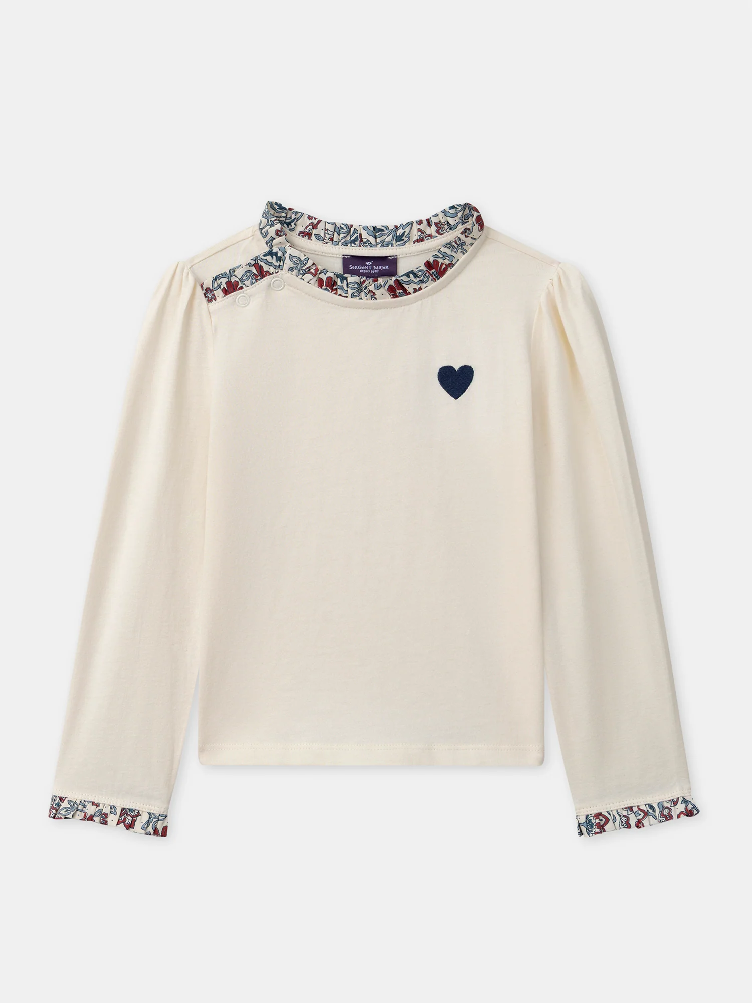 Idéal pour les enfants qui aiment le confort en hiver, ce t-shirt se porte sous un gilet ou un pull. Son jersey effet peau de pêche est agréable et doux. Le volant fleuri et la broderie cœur ajoutent un détail tendre et raffiné.