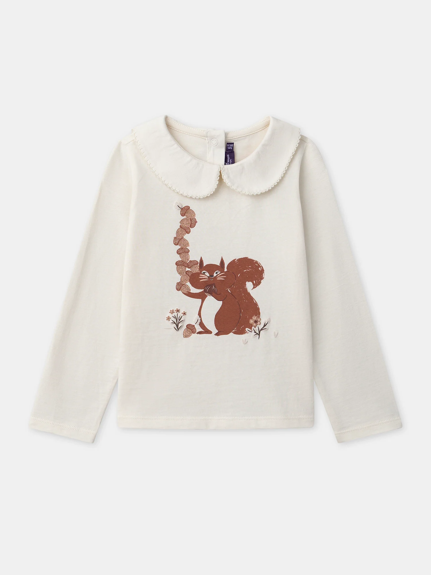 Pour les petits curieux de la forêt, ce t-shirt se porte confortablement en mi-saison. Réalisé en jersey écru, il s’agrémente d’un col claudine raffiné. L’imprimé écureuil apporte une touche ludique et naturelle.