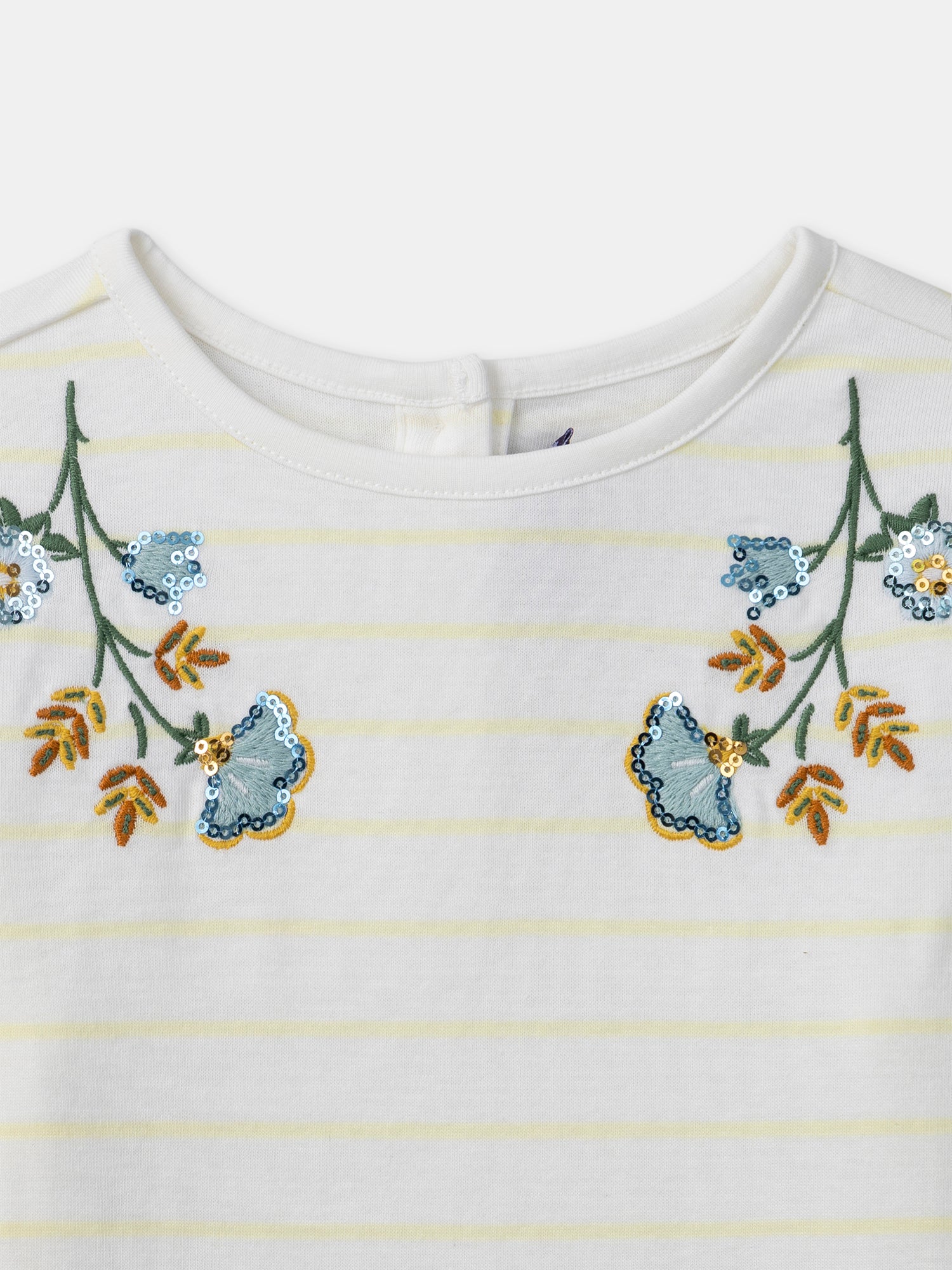 T-shirt marinière en tubique jaune fleurs en sequins Ouverture boutons pression dans le dos
