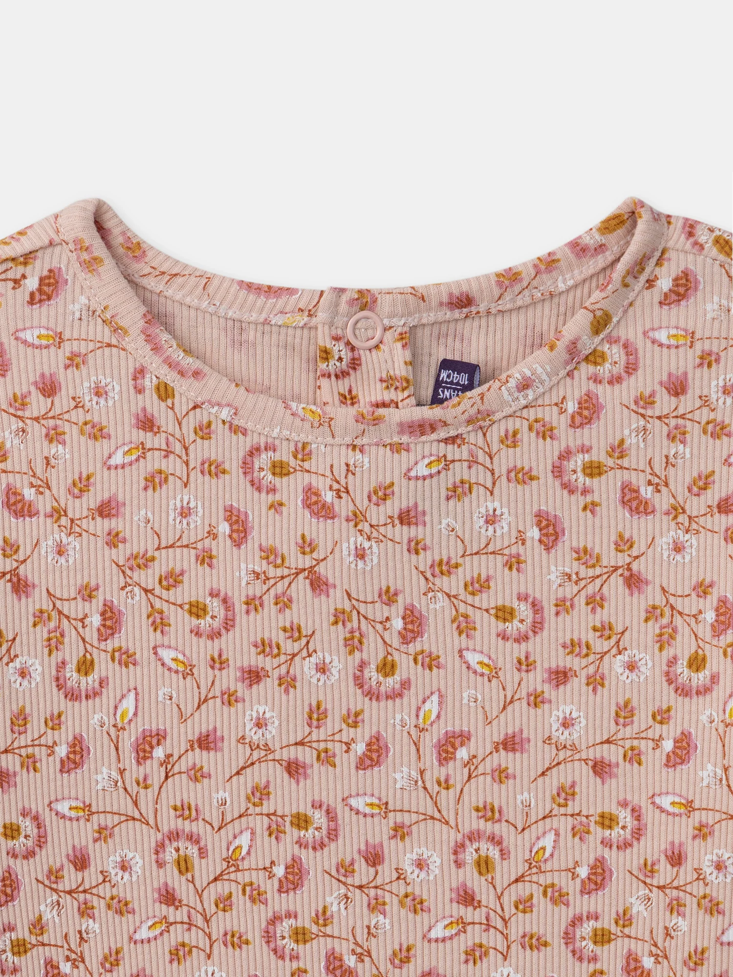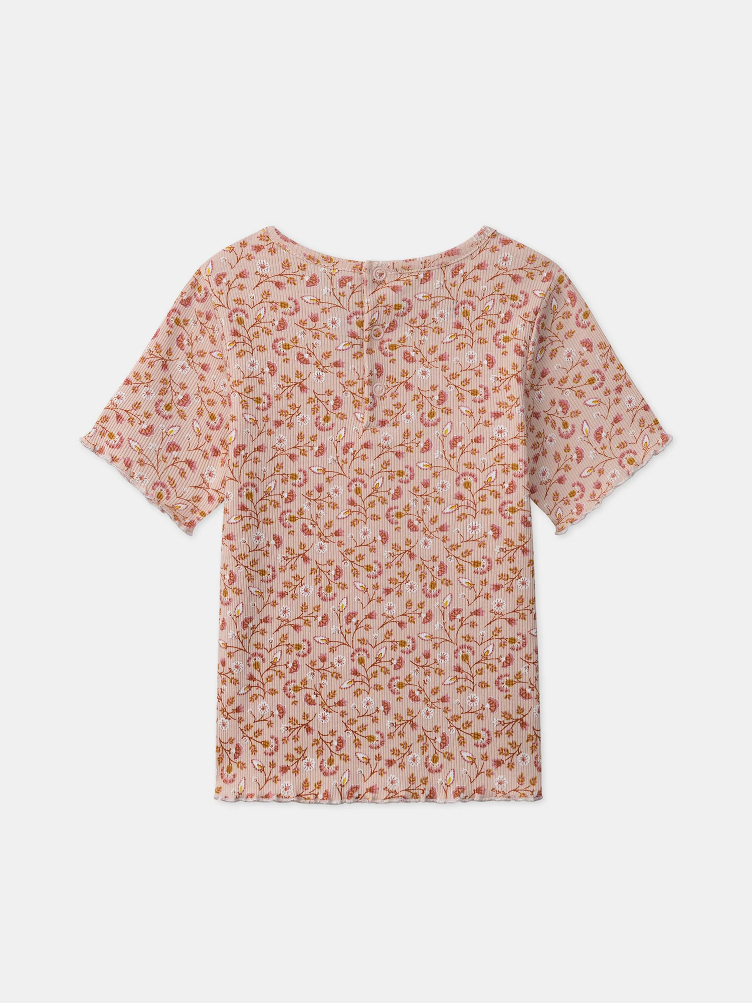 T-shirt rose à bord côte Finitions zigzag en bas de manches et bas de vêtement Ouverture boutons pression dans le dos