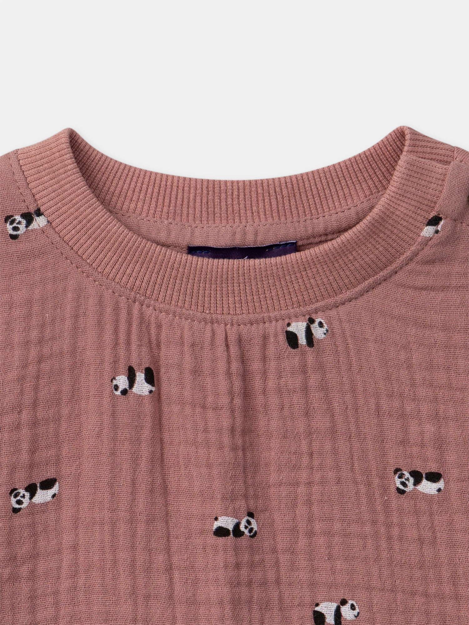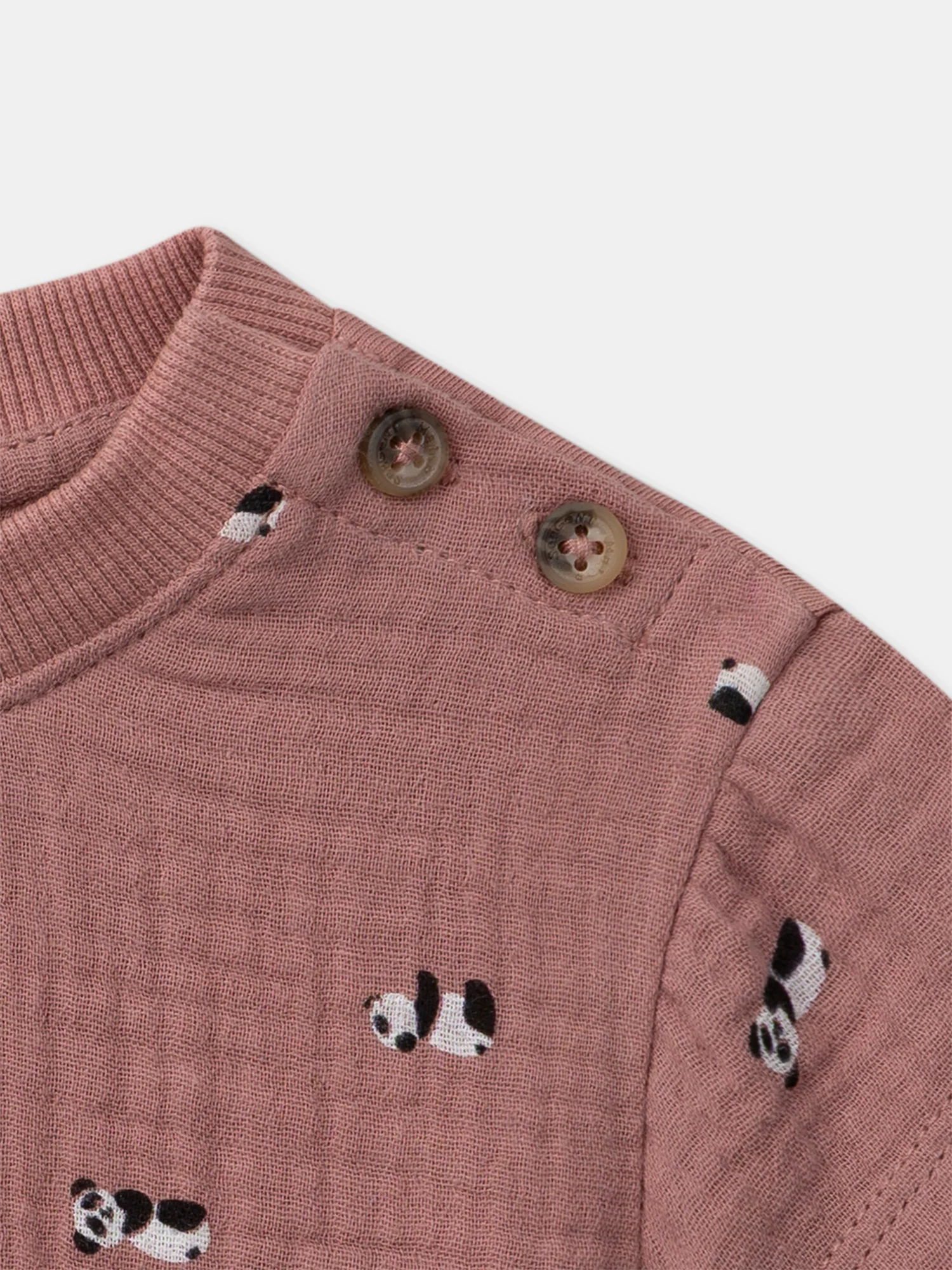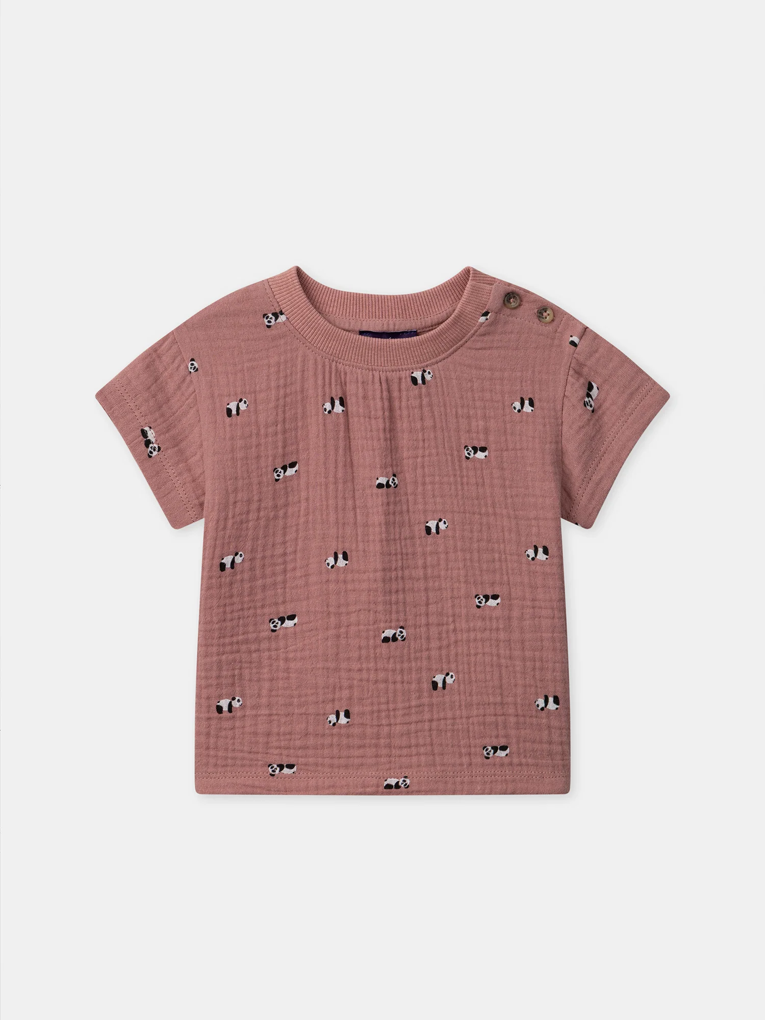 Ce t-shirt est parfait pour les petits fans de pandas, idéal pour le printemps et l’été. Confectionné en coton doux, il combine un dos uni rouge brique en jersey avec un imprimé pandas sur le devant. La vignette tissée au dos et l’ouverture du col par boutons ajoutent des détails pratiques et stylés à cette pièce.