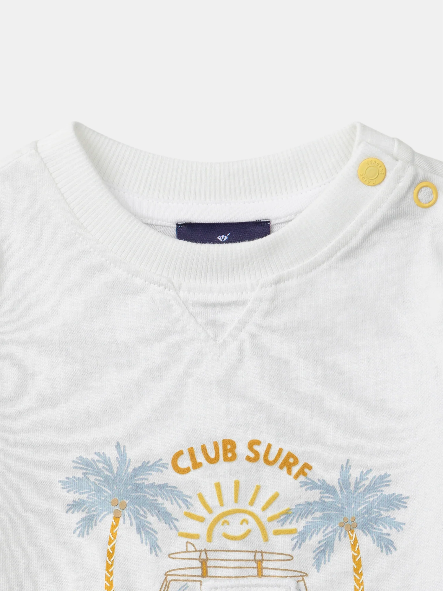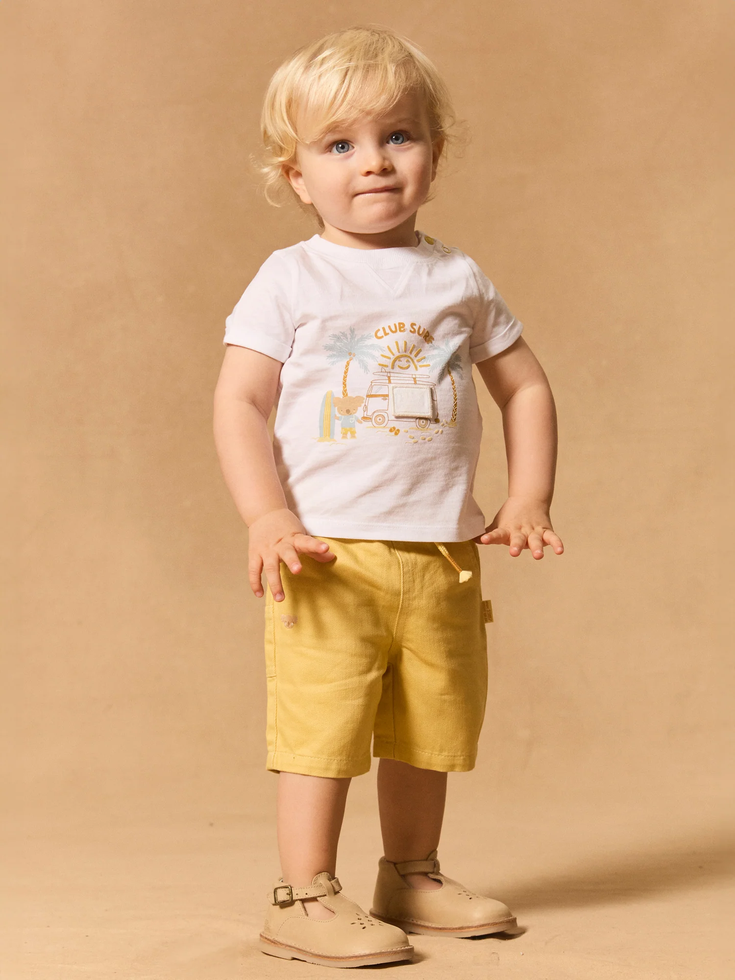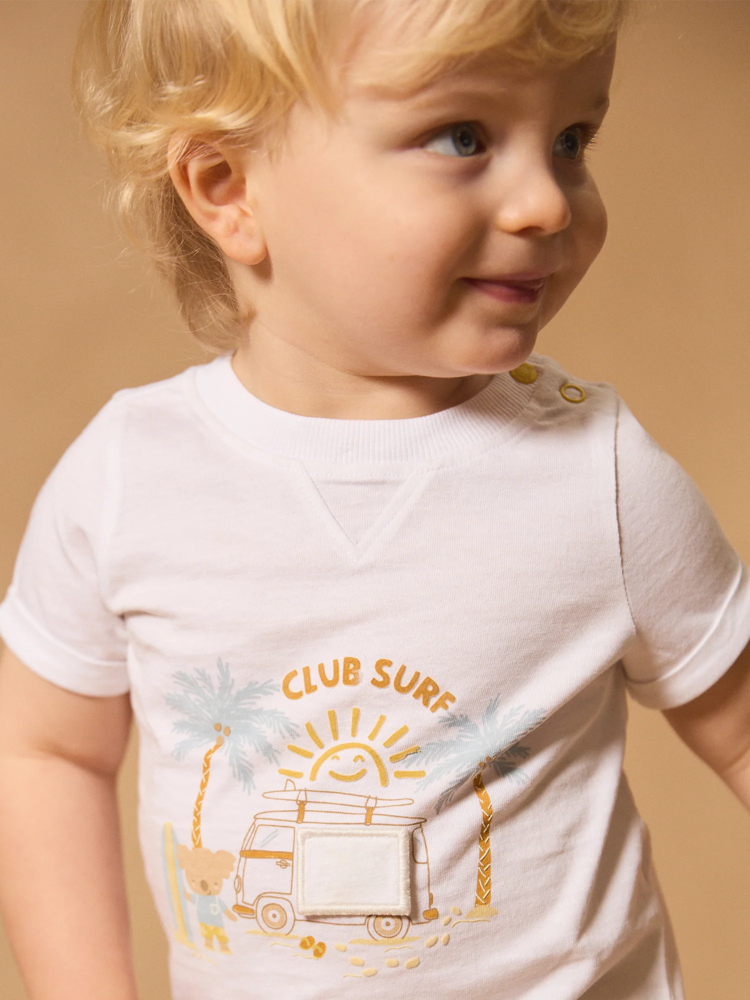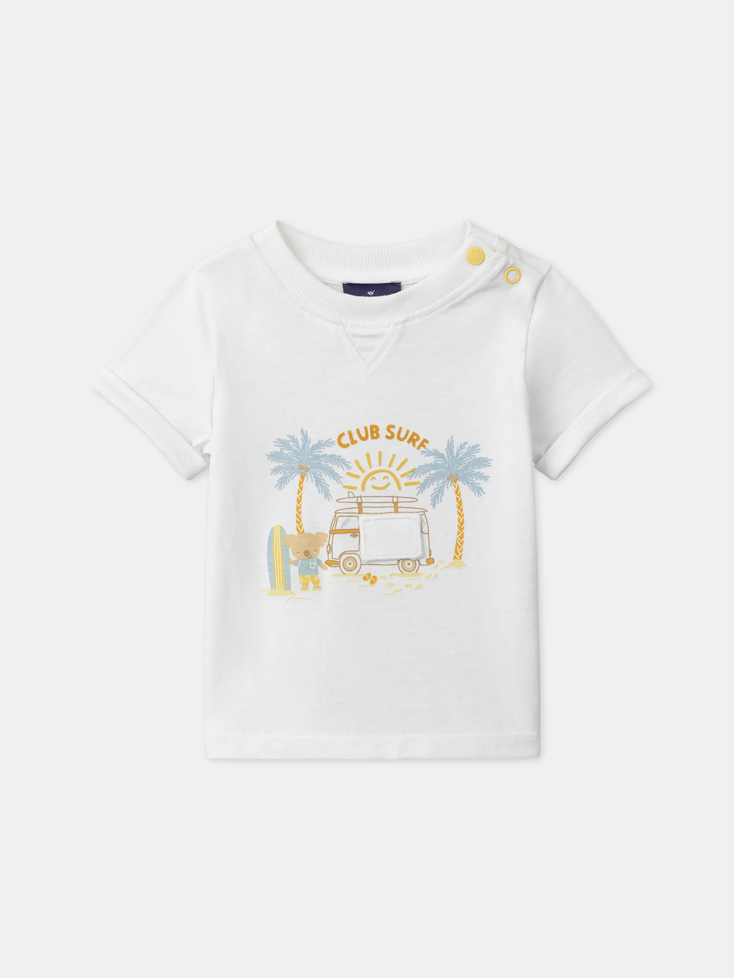 Ce t-shirt koala ludique est idéal pour les enfants pleins de curiosité, parfait pour les journées estivales. Il est conçu avec un imprimé de koalas accompagné d’un patch volant dans des tons doux de jaune pâle, bleu, marron et beige. L’ouverture du col par boutons à pression facilite l’habillage tout en apportant une touche charmante et pratique à la tenue.