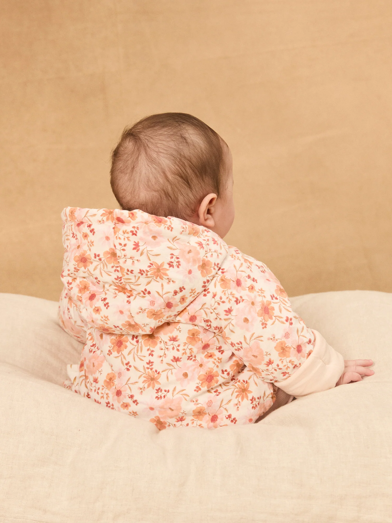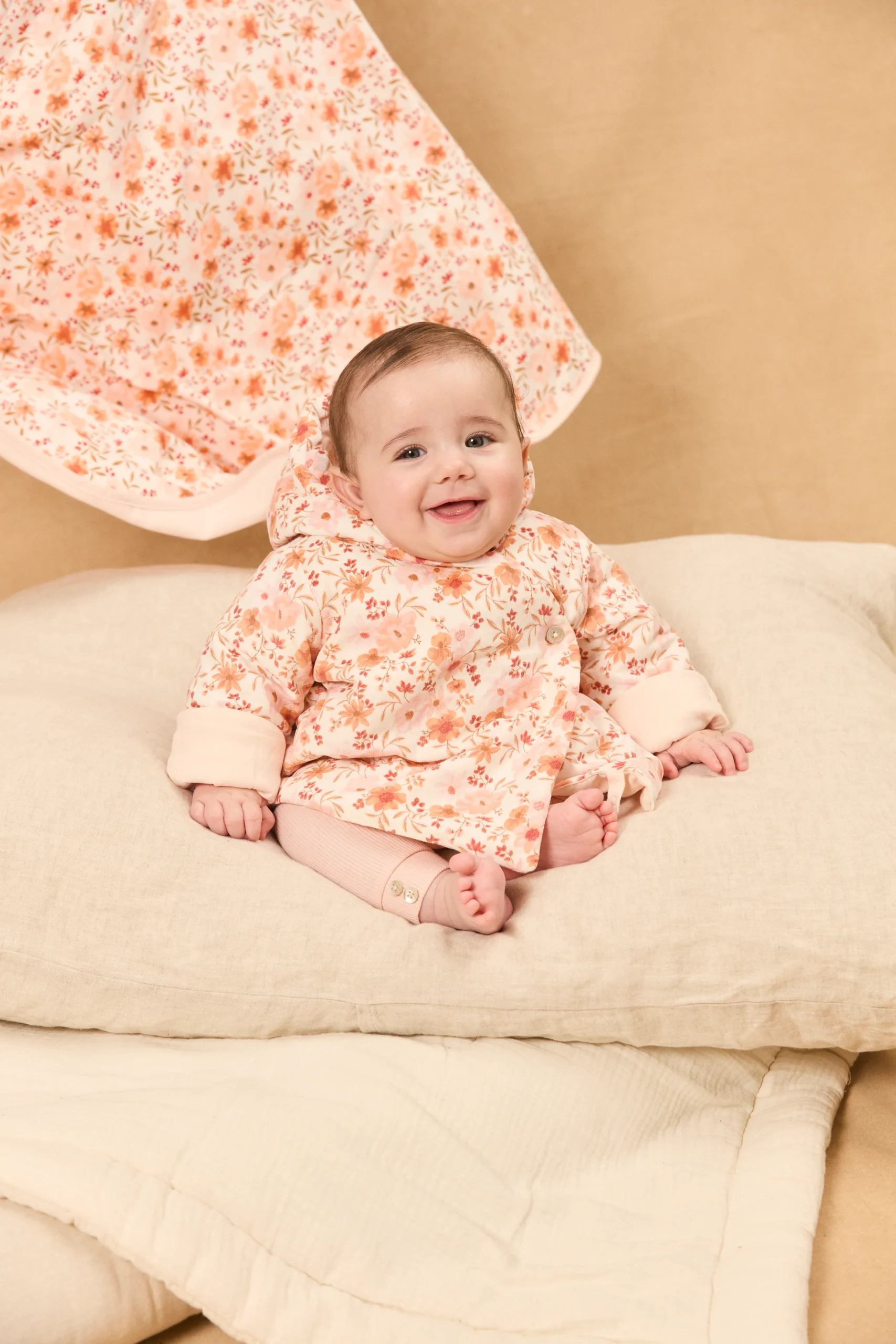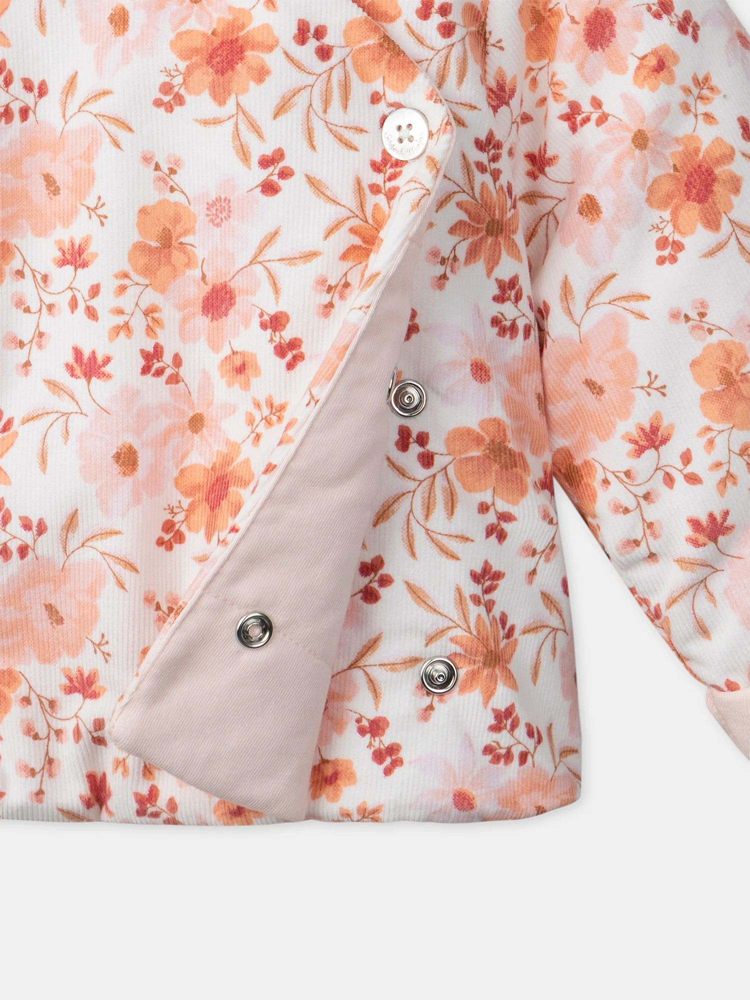 Veste à capuche de naissance en velours côtelé Imprimé fleuri dans les tons rose poudré, orangé, groseille, corail et brun doux sur fond écru Doublure en jersey rose poudré Revers en bas des manches fixés faisant ressortir la doublure Ouverture arrondie avec un bouton en nacre gravés « Sergent Major » Léger matelassage Vendue avec une étiquette […]