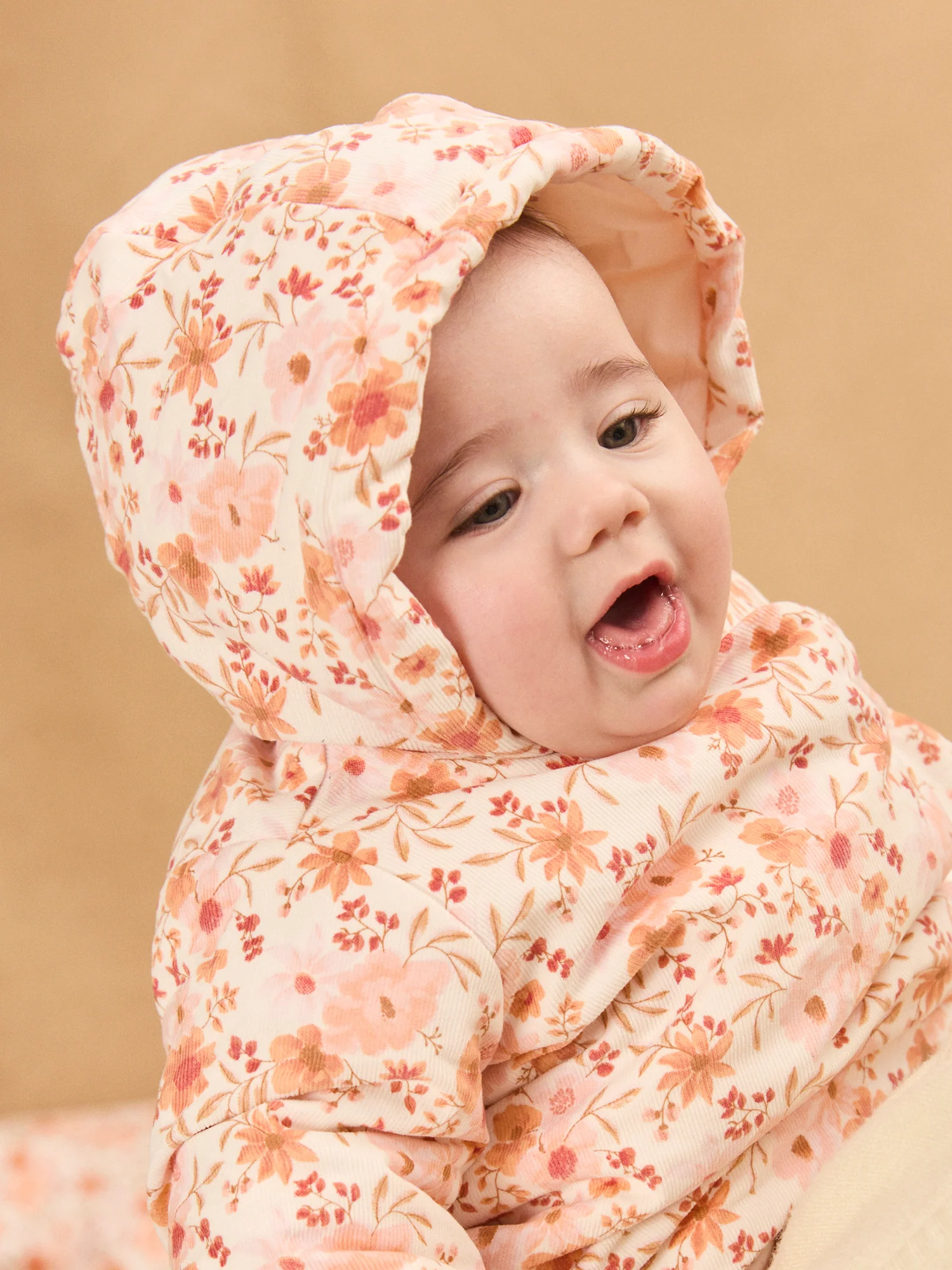 - Imprimé fleuri dans les tons rose poudré, orangé, groseille, corail et brun doux sur fond écru