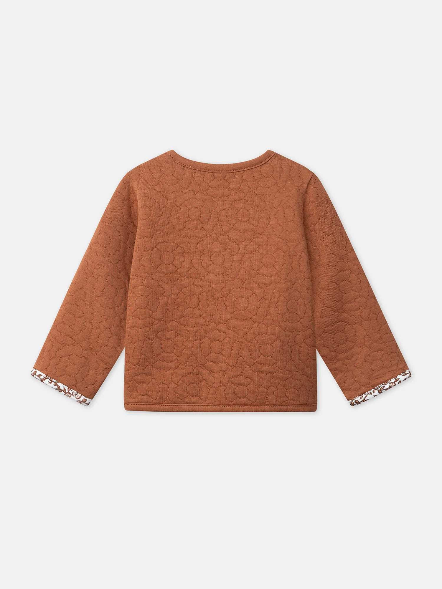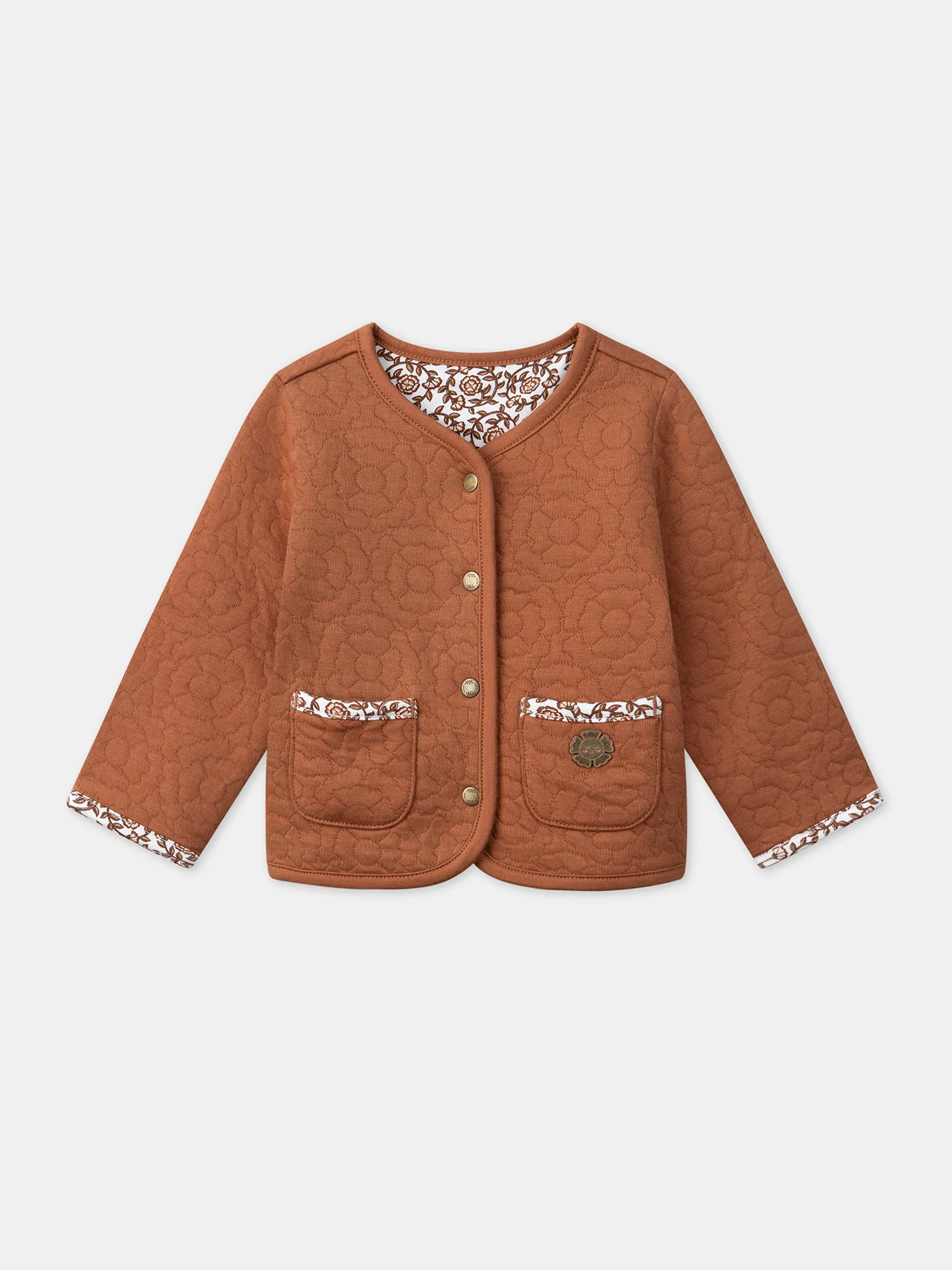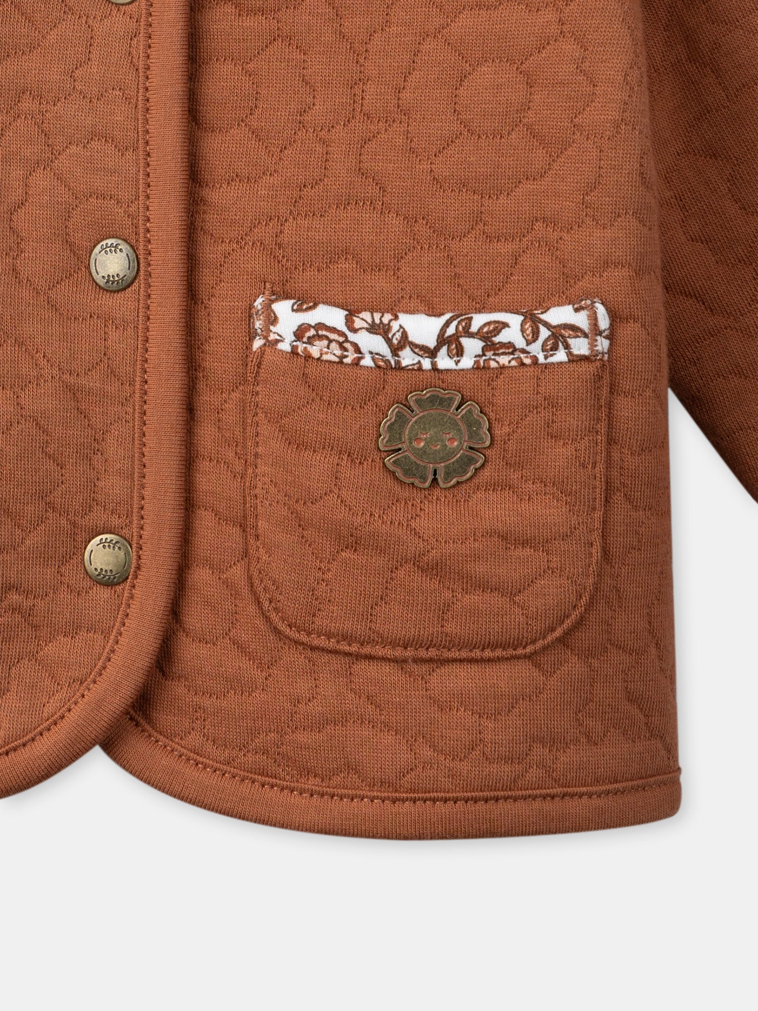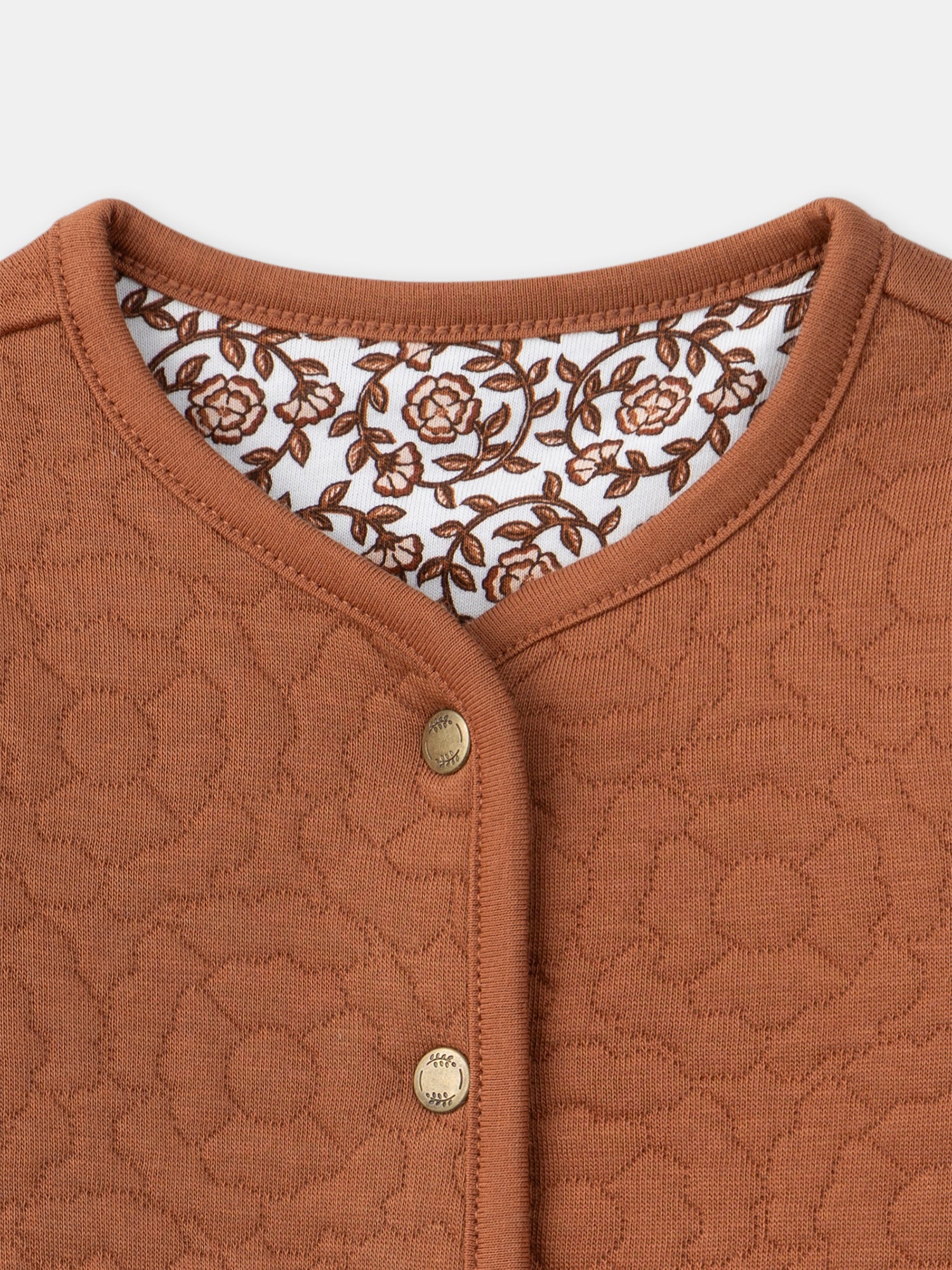 Découvrez notre veste légère matelassée en tubique marron, idéale pour la mi-saison. Le matelassage marron offre un confort optimal tout en maintenant une chaleur douce.Dotée de 2 poches avant agrémentées de détails imprimés fleuris et d’un badge fleur, cette veste ajoute une touche de style charmante à chaque tenue. Les revers de manches imprimés fleuris complètent harmonieusement le design.L’intérieur est décoré d’un imprimé fleurs marron sur fond écru, ajoutant une touche de délicatesse et de raffinement. L’ouverture avant intégrale par boutons à pression fantaisies facilite l’habillage.