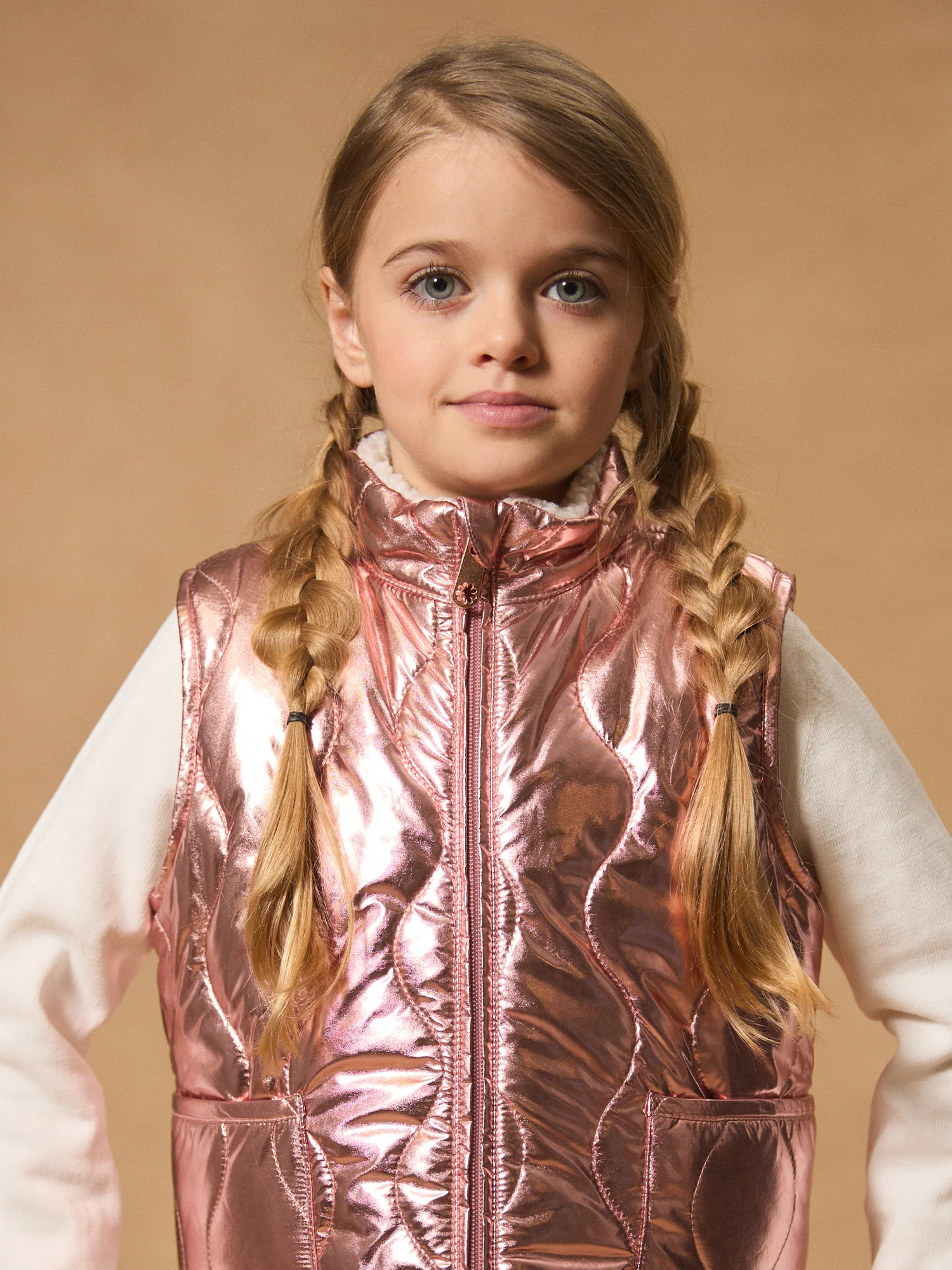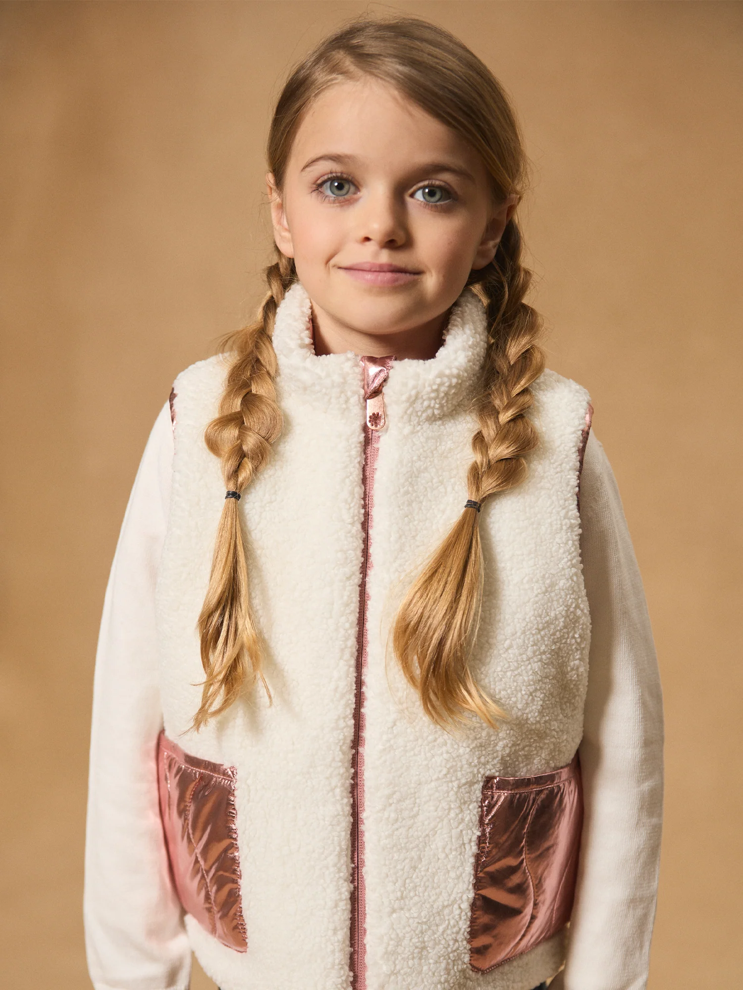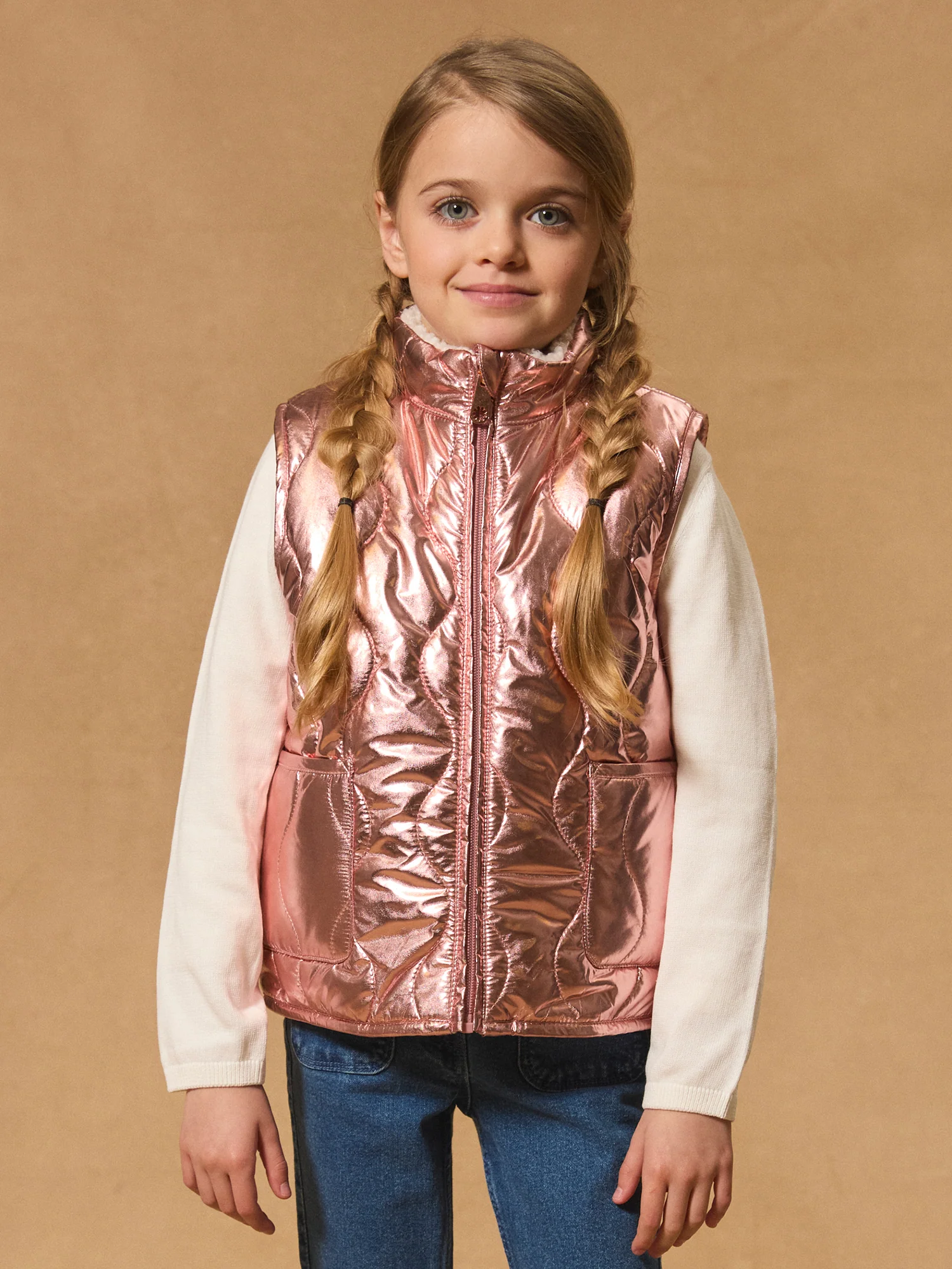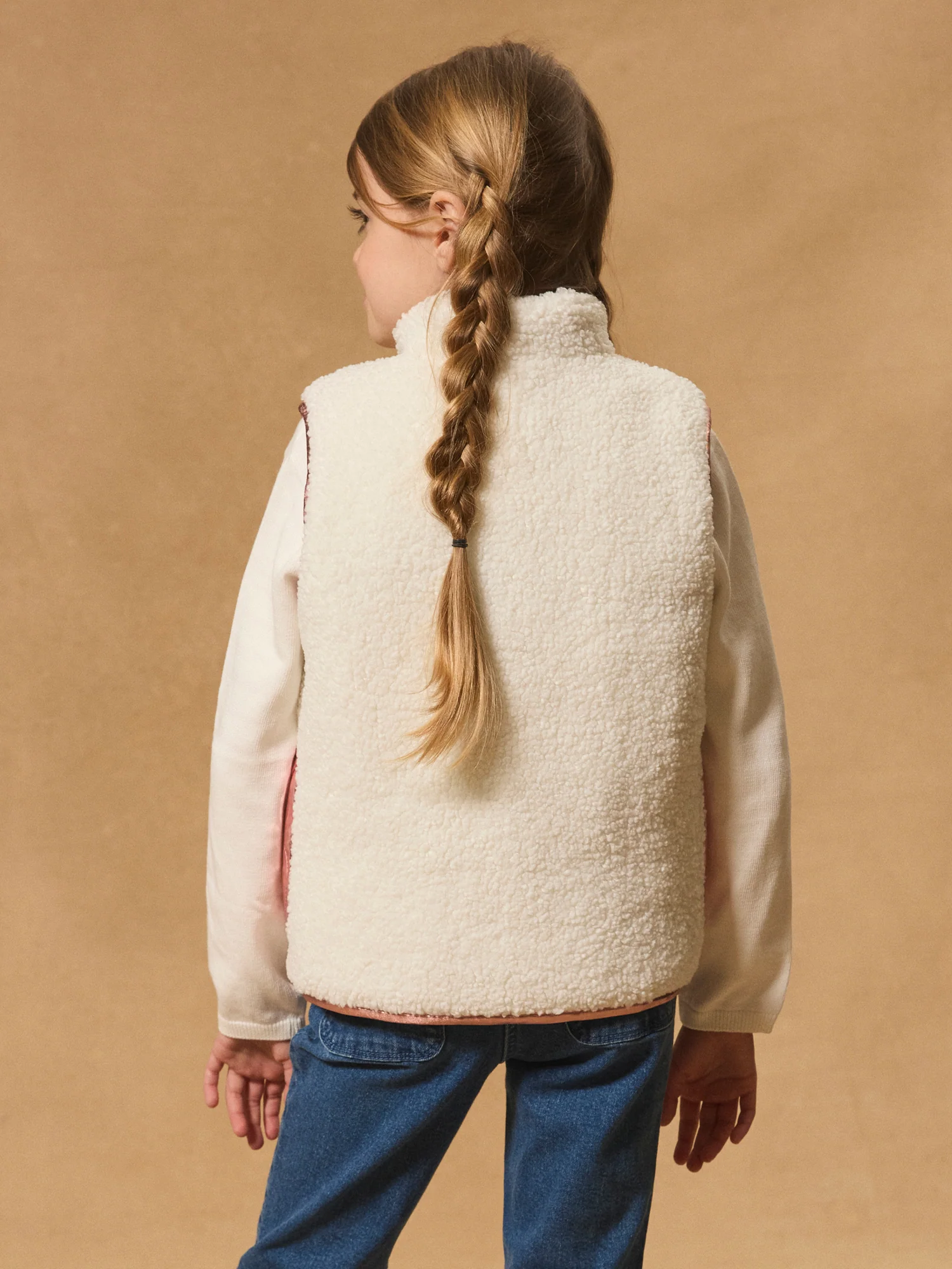 Veste réversible sans manches Face A : rose brillant matelassé, 2 poches sur le côté Face B :en moumoute écrue, 2 poches sur le côté Ouverture zip devant Vous pouvez accéder à la fiche produit relative des qualités et caractéristiques environnementales en cliquant ICI.