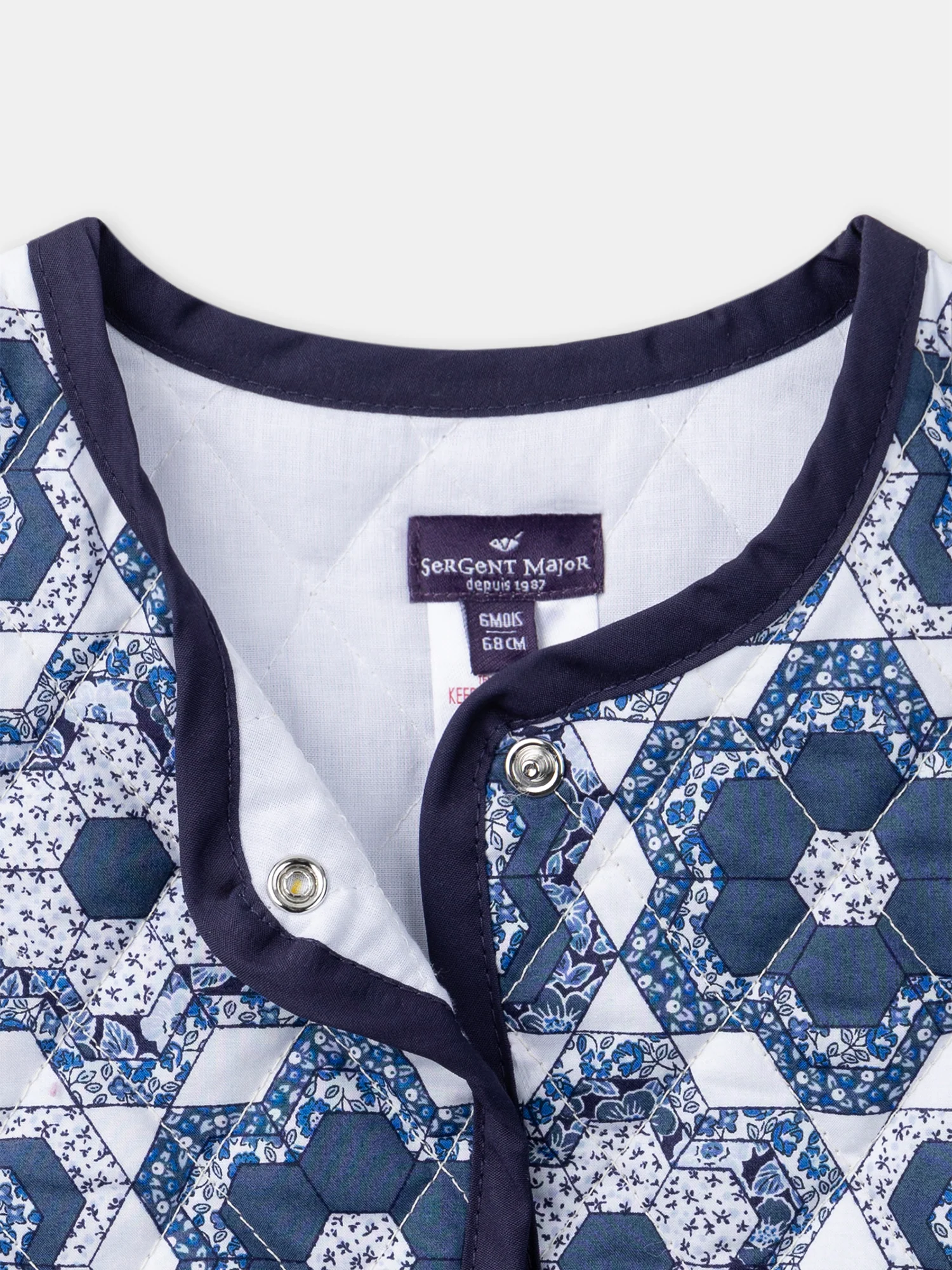 Veste sans manches matelassée. Ouverture à bouton-pression à motif fleuri Biais contrastant aux finitions Doublure écrue Ce produit appartient à la Collection Pastel à Lisbonne Vous pouvez accéder à la fiche produit relative aux qualités et caractéristiques environnementales en cliquant ICI.