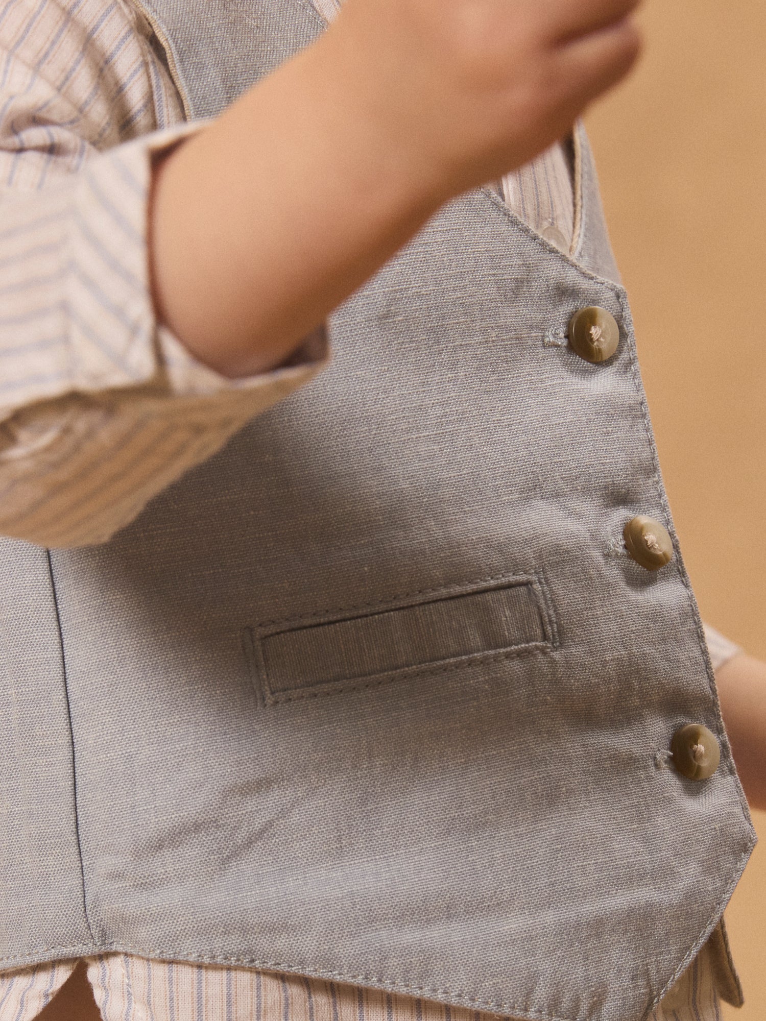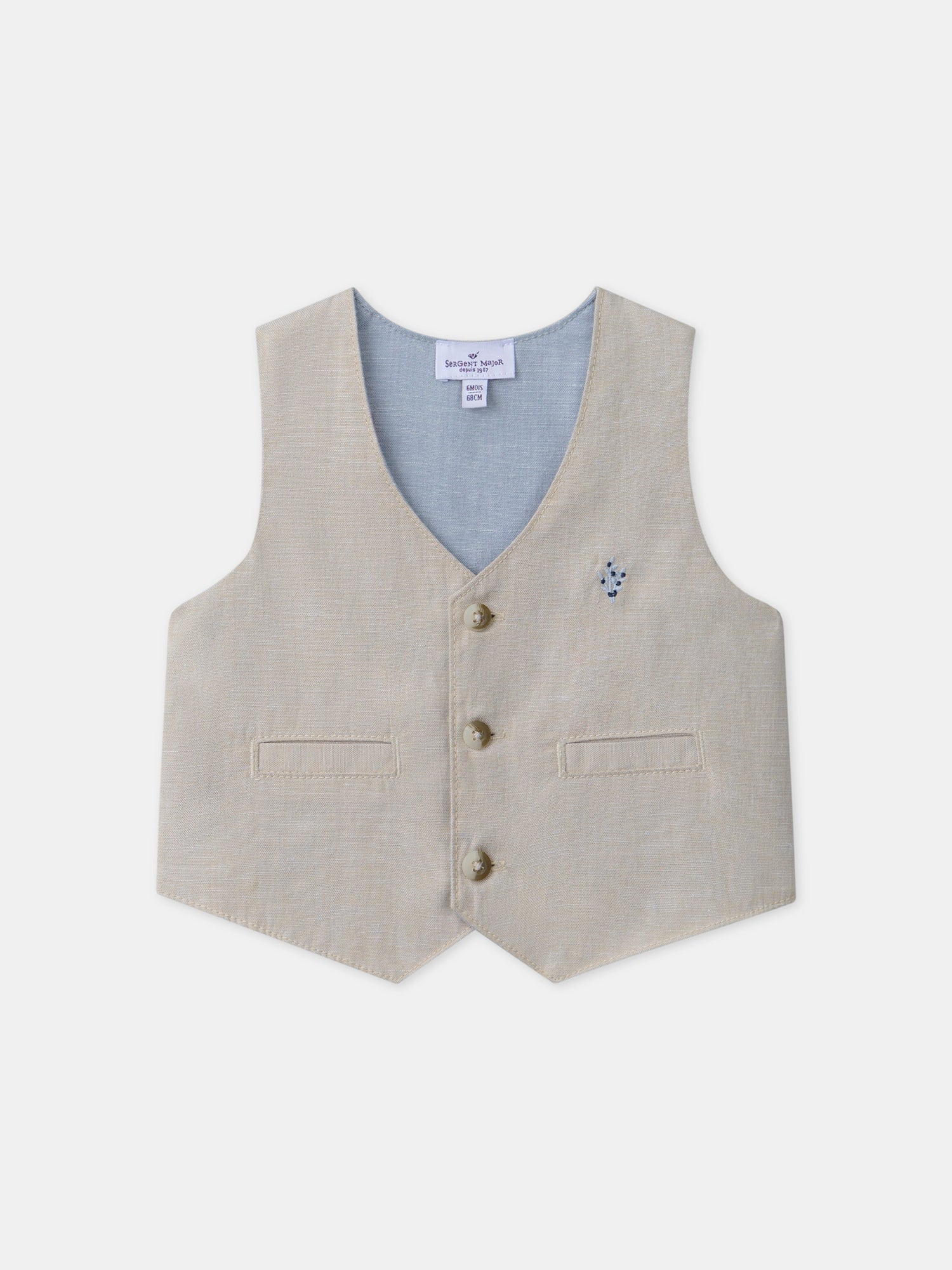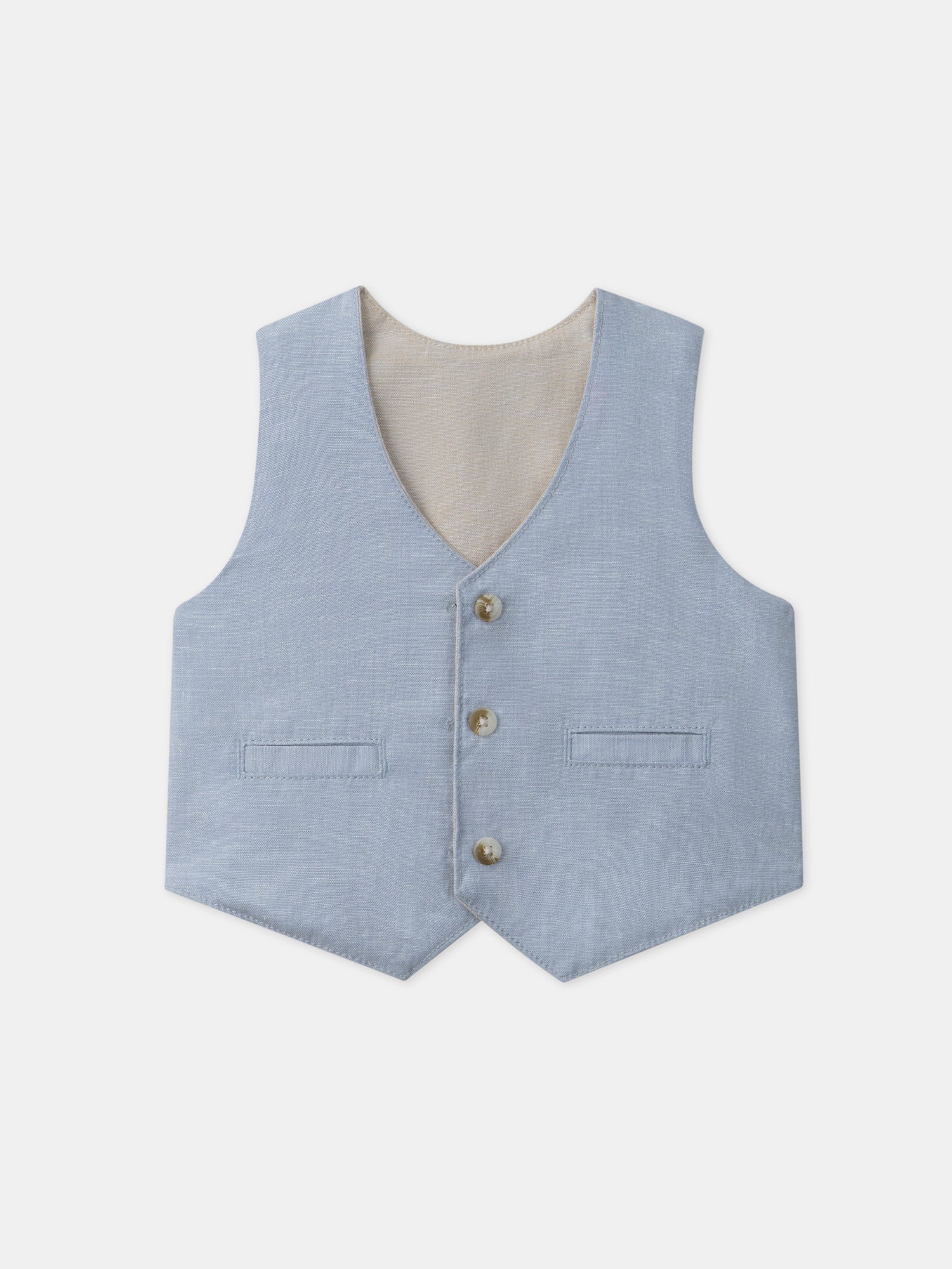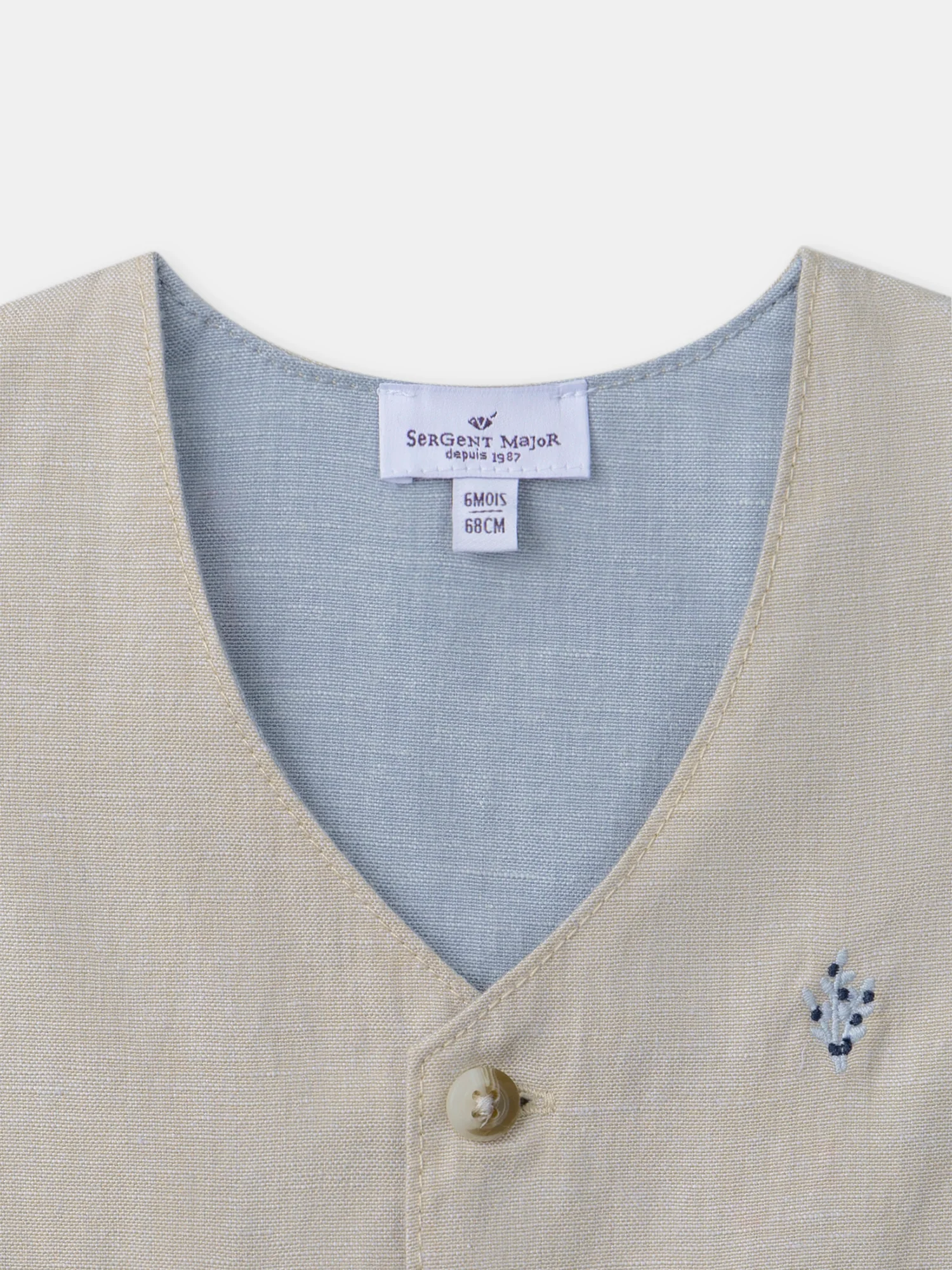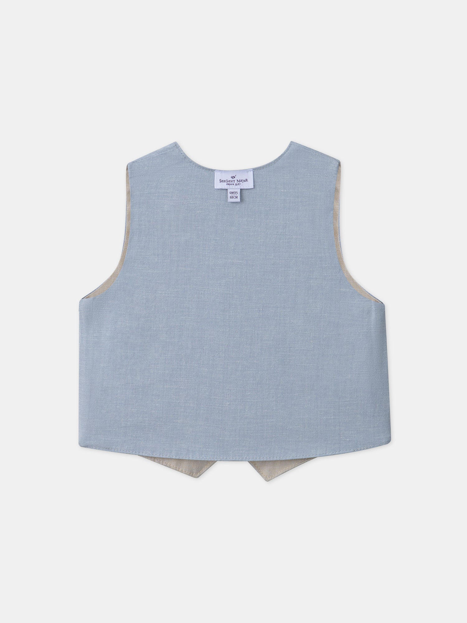 Ce veston sans manches réversible offre deux looks distincts. D’un côté, il présente une broderie élégante de feuillage bleu ciel et bleu marine, accompagnée de fausses poches décoratives. De l’autre côté, le veston est uni bleu ciel, avec également des fausses poches décoratives pour un style épuré. L’ouverture avant est intégrale et se fait par des boutons nacrés, ajoutant une touche soignée et sophistiquée au vêtement. Ce veston réversible permet de varier les styles en fonction des envies, tout en restant pratique et élégant.